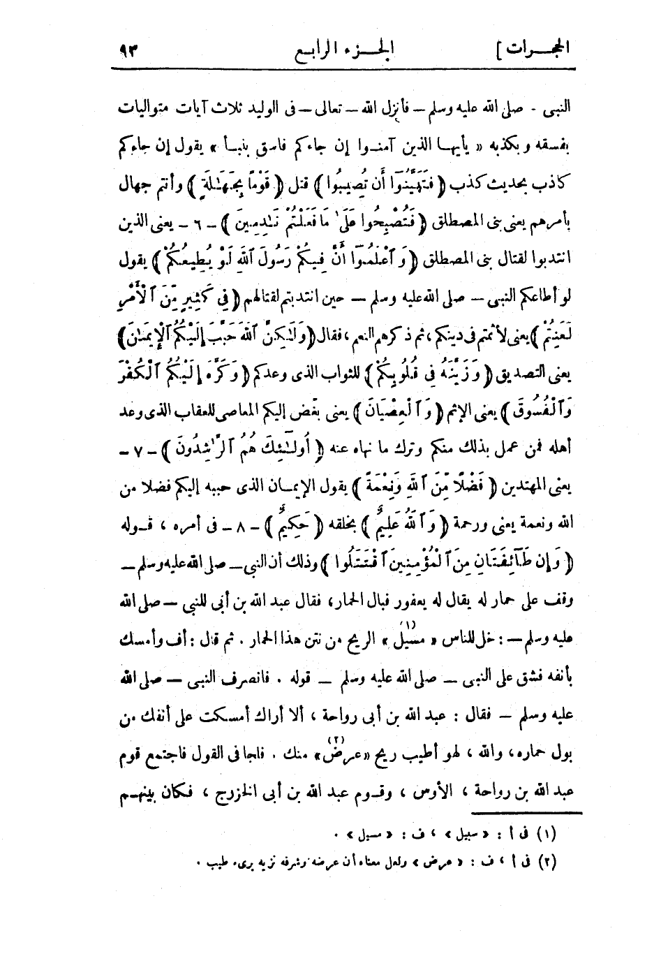 فأنزل الله- تعالى- في الوليد ثلاث آيات متواليات بفسقه وبكذبه «يا أَيُّهَا الَّذِينَ آمَنُوا إِنْ جاءَكُمْ فاسِقٌ بِنَبَإٍ» يقول إن جاءكم كاذب بحديث كذب فَتَبَيَّنُوا أَنْ تُصِيبُوا قتل قَوْماً بِجَهالَةٍ وأنتم جهال بأمرهم يعني بني المصطلق فَتُصْبِحُوا عَلى مَا فَعَلْتُمْ نادِمِينَ- 6- يعني الذين انتدبوا لقتال بني المصطلق وَاعْلَمُوا أَنَّ فِيكُمْ رَسُولَ اللَّهِ لَوْ يُطِيعُكُمْ يقول لو أطاعكم النبي- صلى الله عليه وسلم- حين انتدبتم لقتالهم فِي كَثِيرٍ مِنَ الْأَمْرِ لَعَنِتُّمْ يعني لأثمتم في دينكم، ثم ذكرهم النعم، فقال وَلكِنَّ اللَّهَ حَبَّبَ إِلَيْكُمُ الْإِيمانَ يعنى التصديق وَزَيَّنَهُ فِي قُلُوبِكُمْ للثواب الذي وعدكم وَكَرَّهَ إِلَيْكُمُ الْكُفْرَ وَالْفُسُوقَ يعني الإثم وَالْعِصْيانَ يعني بغض إليكم المعاصي للعقاب الذي وعد أهله فمن عمل بذلك منكم وترك ما نهاه عنه أُولئِكَ هُمُ الرَّاشِدُونَ- 7- يعنى المهتدين فَضْلًا مِنَ اللَّهِ وَنِعْمَةً يقول الإيمان الذي حببه إليكم فضلا من الله ونعمة يعنى ورحمة وَاللَّهُ عَلِيمٌ بخلقه حَكِيمٌ- 8- فى أمره، قوله وَإِنْ طائِفَتانِ مِنَ الْمُؤْمِنِينَ اقْتَتَلُوا وذلك