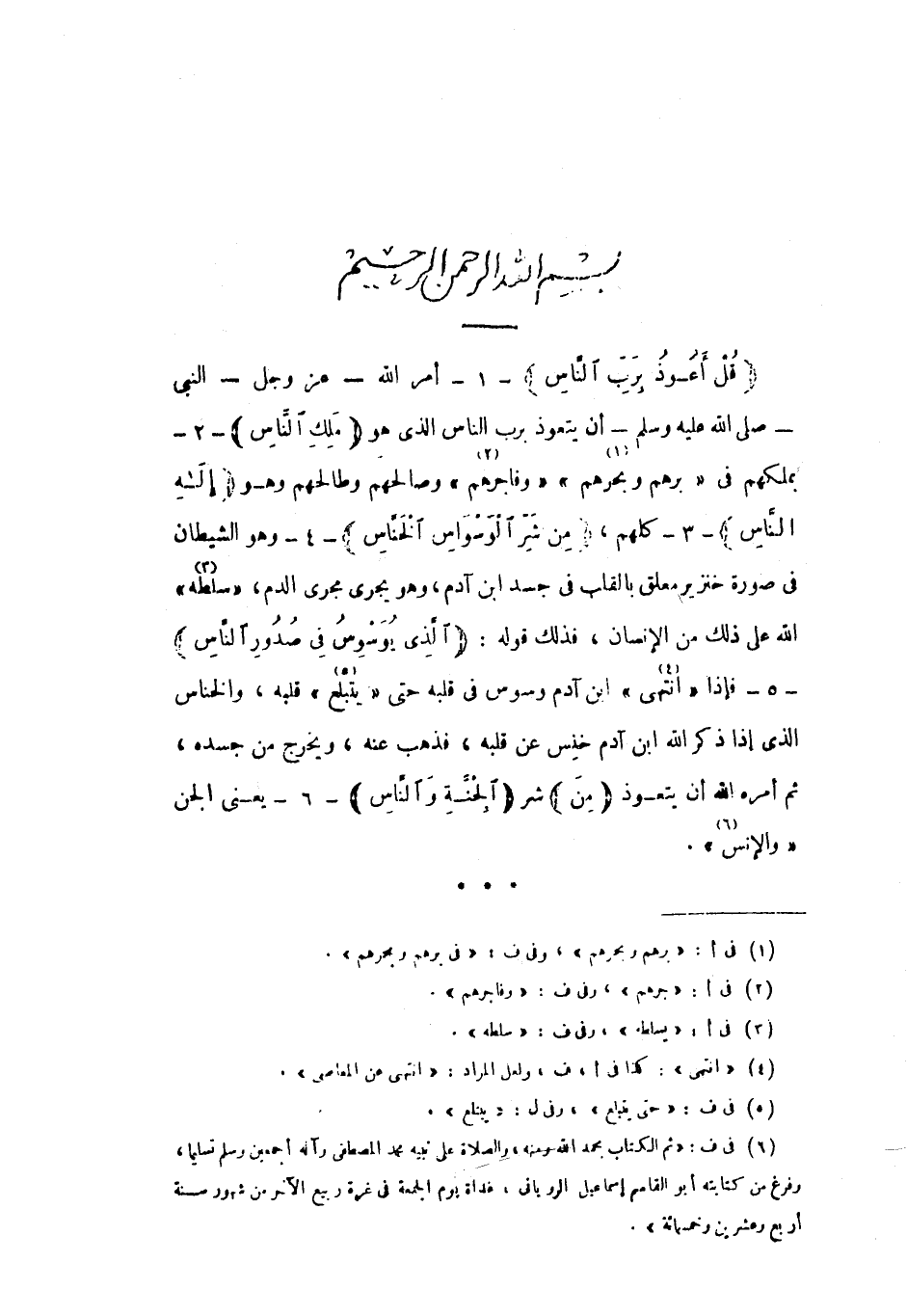 بِسْمِ اللَّهِ الرَّحْمنِ الرَّحِيمِ قُلْ أَعُوذُ بِرَبِّ الْفَلَقِ- 1- وذلك أن لبيد بن عاصم بن مالك، ويقال ابن أعصم اليهودي، سحر النبي- صلى الله عليه وسلم- في إحدى عشرة عقدة في وتر، فجعله فى «بئر لها سبع موانى «1» » في جف طلعة كان النبي- صلى الله عليه وسلم- يستند إليها فدب فيه السحر، واشتد عليه ثلاث ليال، حتى مرض مرضًا شديدًا، وجزعت النساء، فنزلت المعوذات، فبينما رسول الله- صلى الله عليه وسلم- نائم إذ رأى كأن ملكين قد أتياه، فقعد أحدهما عند رأسه، والآخر عند رجليه، ثم قال أحدهما لصاحبه: ما شكواه؟ قال: أصابه طب- يقول سحر-، قال: فمن طبه؟ قال: لبيد بن أعصم اليهودي. قال [257 ب] :