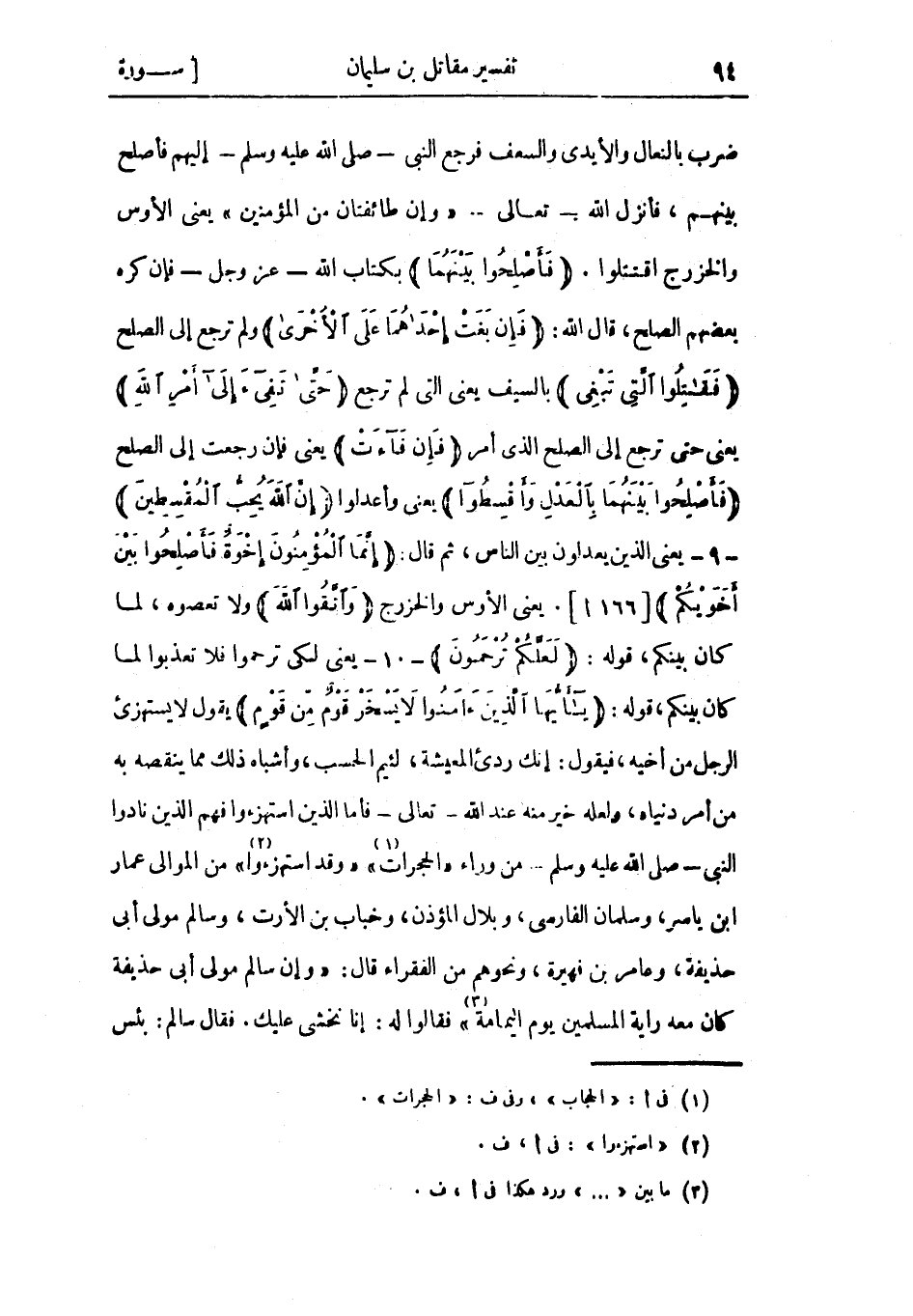 يعني الأوس والخزرج اقتتلوا. فَأَصْلِحُوا بَيْنَهُما بكتاب الله- عز وجل- فإن كره بعضهم الصلح، قال الله: فَإِنْ بَغَتْ إِحْداهُما عَلَى الْأُخْرى ولم ترجع إلى الصلح فَقاتِلُوا الَّتِي تَبْغِي بالسيف يعني التي لم ترجع حَتَّى تَفِيءَ إِلى أَمْرِ اللَّهِ يعنى حتى ترجع إلى الصلح الذي أمر فَإِنْ فاءَتْ يعني فإن رجعت إلى الصلح فَأَصْلِحُوا بَيْنَهُما بِالْعَدْلِ وَأَقْسِطُوا يعنى وأعدلوا إِنَّ اللَّهَ يُحِبُّ الْمُقْسِطِينَ- 9- يعنى الذين يعدلون بين الناس، ثم قال: إِنَّمَا الْمُؤْمِنُونَ إِخْوَةٌ فَأَصْلِحُوا بَيْنَ أَخَوَيْكُمْ [166 أ] . يعني الأوس والخزرج وَاتَّقُوا اللَّهَ ولا تعصوه، لما كان بينكم، قوله: لَعَلَّكُمْ تُرْحَمُونَ- 10- يعني لكي ترحموا فلا تعذبوا لما كان بينكم، قوله: يا أَيُّهَا الَّذِينَ آمَنُوا لا يَسْخَرْ قَوْمٌ مِنْ قَوْمٍ يقول لا يستهزئ الرجل من أخيه، فيقول: إنك ردئ المعيشة، لئيم الحسب، وأشباه ذلك مما ينقصه به من أمر دنياه، ولعله خير منه عند الله- تعالى- فأما الذين استهزءوا فهم الذين نادوا النبي- صلى الله عليه وسلم- من وراء «الحجرات» «1» «وقد استهزءوا «2» » من الموالي عمار ابن ياسر، وسلمان الفارسي، وبلال المؤذن، وخباب بن الأرت، وسالم مَوْلَى أَبِي حُذَيْفة، وعامر بن فهيرة، ونحوهم من الفقراء قال: «وإن سالم مولى أبي حذيفة كان معه راية المسلمين يوم اليمامة» «3» فقالوا له: إنا نخشى عليك. فقال سالم: بئس