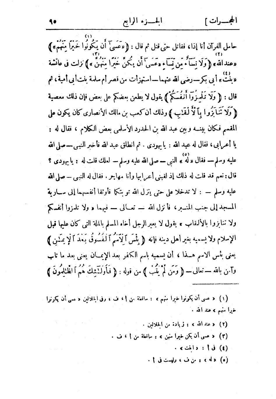حامل القرآن أنا إذًا، فقاتل حتى قُتِلَ ثم قال: عَسى أَنْ يَكُونُوا «1» خَيْراً مِنْهُمْ «عند الله» «2» وَلا نِساءٌ مِنْ نِساءٍ «عَسى أَنْ يَكُنَّ خَيْراً مِنْهُنَّ» «3» نزلت في عائشة «بنت» «4» أبي بكر- رضي الله عنهما- استهزأت من قصر أم سلمة بنت أبي أمية، ثم قال: وَلا تَلْمِزُوا أَنْفُسَكُمْ يقول لا يطعن بعضكم على بعض فإن ذلك معصية وَلا تَنابَزُوا بِالْأَلْقابِ وذلك