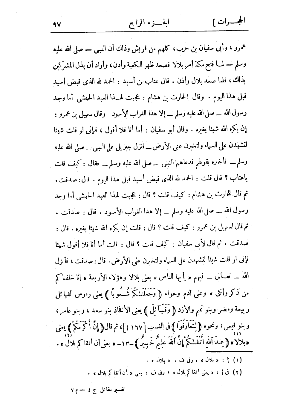 يعنى بلالا وهؤلاء الأربعة «إِنَّا خَلَقْناكُمْ مِنْ ذَكَرٍ وَأُنْثى» وعنى آدم وحواء وَجَعَلْناكُمْ شُعُوباً يعني رءوس القبائل ربيعة ومضر وبنو تميم والأزد وَقَبائِلَ يعني الأفخاذ بنو سعد، وبنو عامر، وبنو قيس، ونحوه لِتَعارَفُوا فى النسب [167 أ] ، ثم قال إِنَّ أَكْرَمَكُمْ يعني «بلالا» «1» عِنْدَ اللَّهِ أَتْقاكُمْ إِنَّ اللَّهَ عَلِيمٌ خَبِيرٌ- 13- «يعنى أن أتقاكم بلال «2» » .