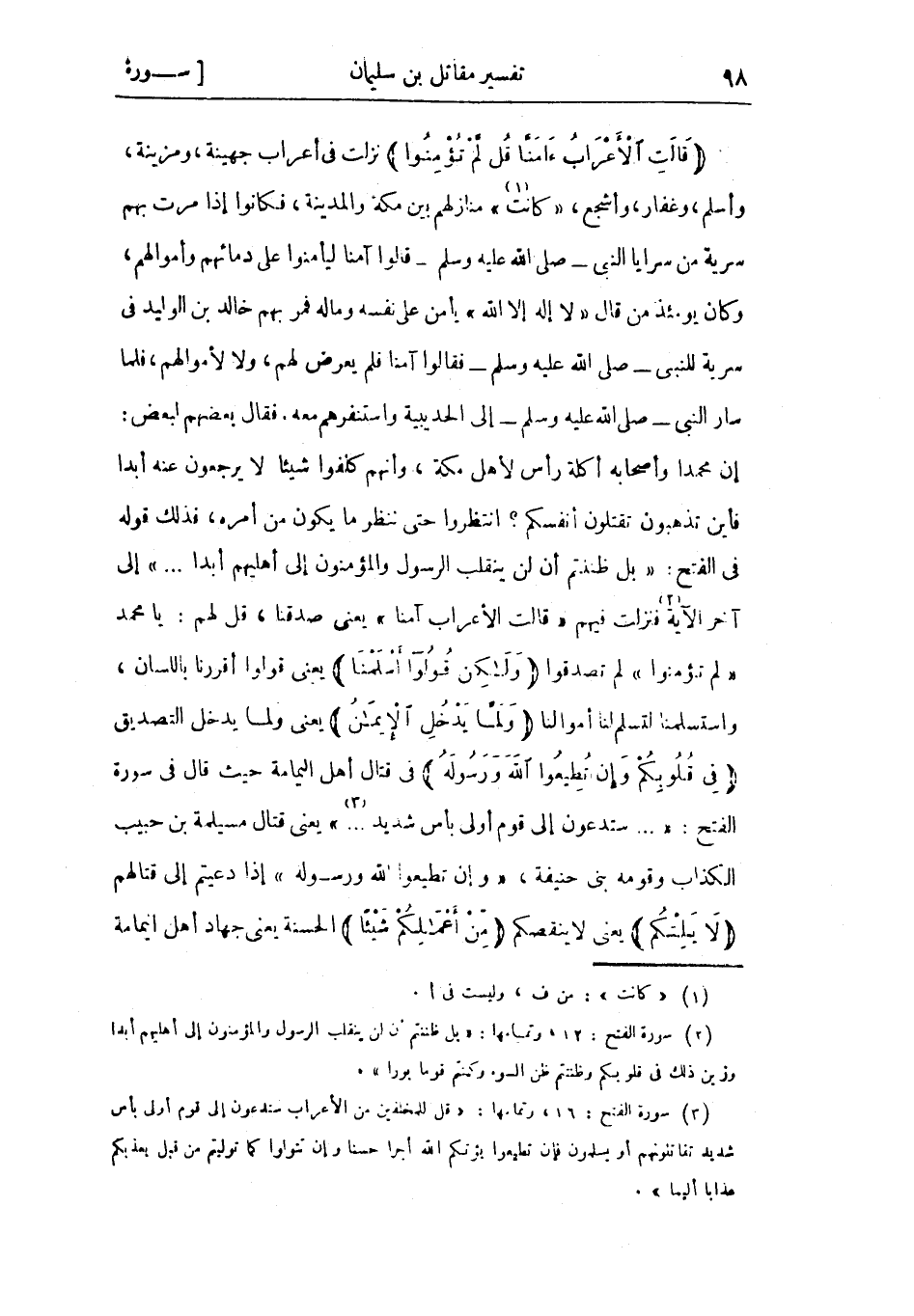 (3) سورة الفتح: 16، وتمامها: قُلْ لِلْمُخَلَّفِينَ مِنَ الْأَعْرابِ سَتُدْعَوْنَ إِلى قَوْمٍ أُولِي بَأْسٍ شَدِيدٍ تُقاتِلُونَهُمْ أَوْ يُسْلِمُونَ فَإِنْ تُطِيعُوا يُؤْتِكُمُ اللَّهُ أَجْراً حَسَناً وَإِنْ تَتَوَلَّوْا كَما تَوَلَّيْتُمْ مِنْ قَبْلُ يُعَذِّبْكُمْ عَذاباً أَلِيماً.