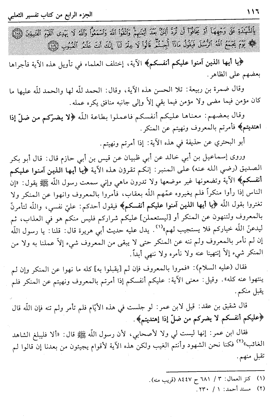 يا أَيُّهَا الَّذِينَ آمَنُوا عَلَيْكُمْ أَنْفُسَكُمْ الآية، اختلف العلماء في تأويل هذه الآية فأجراها بعضهم على الظاهر.