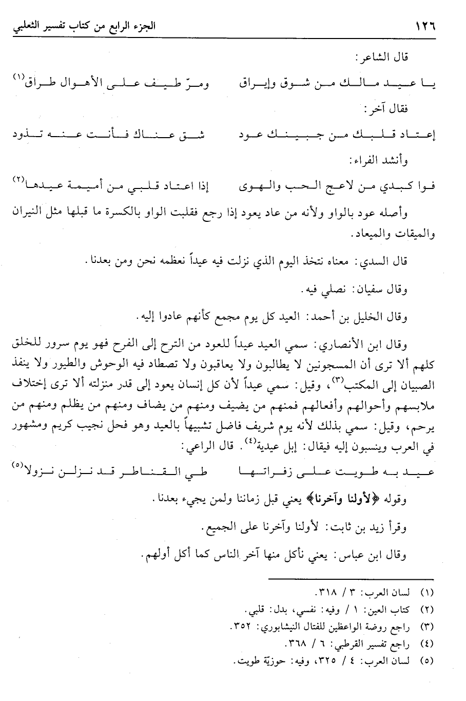 وقال ابن الأنصاري: سمي العيد عيدا للعود من الترح إلى الفرح فهو يوم سرور للخلق كلهم ألا ترى أن المسجونين لا يطالبون ولا يعاقبون ولا تصطاد فيه الوحوش والطيور ولا ينفذ الصبيان إلى المكتب «3» ، وقيل: سمي عيدا لأن كل إنسان يعود إلى قدر منزلته ألا ترى إختلاف ملابسهم وأحوالهم وأفعالهم فمنهم من يضيف ومنهم من يضاف ومنهم من يظلم ومنهم من يرحم، وقيل: سمي بذلك لأنه يوم شريف فاضل تشبيها بالعيد وهو فحل نجيب كريم ومشهور في العرب وينسبون إليه فيقال: إبل عيدية «4» . قال الراعي: