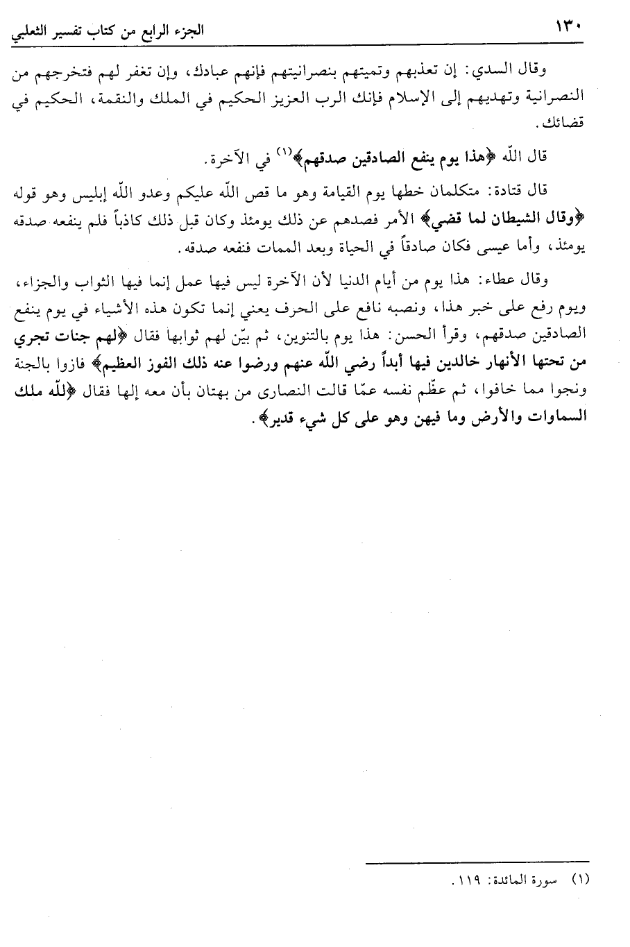 قال قتادة: متكلمان خطها يوم القيامة وهو ما قص الله عليكم وعدو الله إبليس وهو قوله وَقالَ الشَّيْطانُ لَمَّا قُضِيَ الْأَمْرُ فصدهم عن ذلك يومئذ وكان قبل ذلك كاذبا فلم ينفعه صدقه يومئذ، وأما عيسى فكان صادقا في الحياة وبعد الممات فنفعه صدقه.