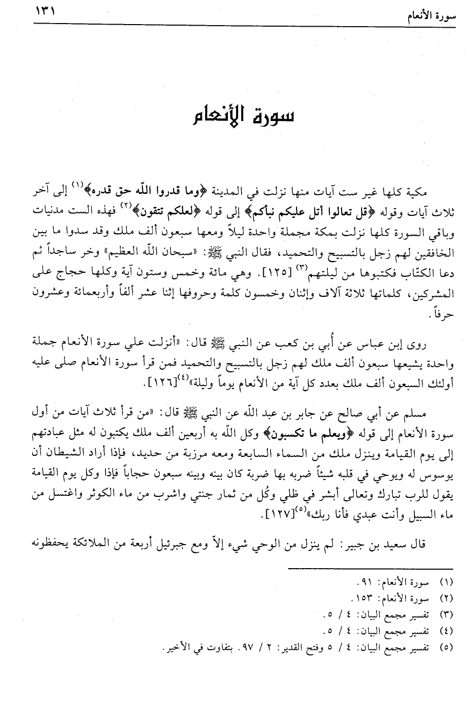 روى ابن عباس عن أبي بن كعب عن النبي صلى الله عليه وسلّم قال: «أنزلت علي سورة الأنعام جملة واحدة يشيعها سبعون ألف ملك لهم زجل بالتسبيح والتحميد فمن قرأ سورة الأنعام صلى عليه أولئك السبعون ألف ملك بعدد كل آية من الأنعام يوما وليلة» «4» [126] .