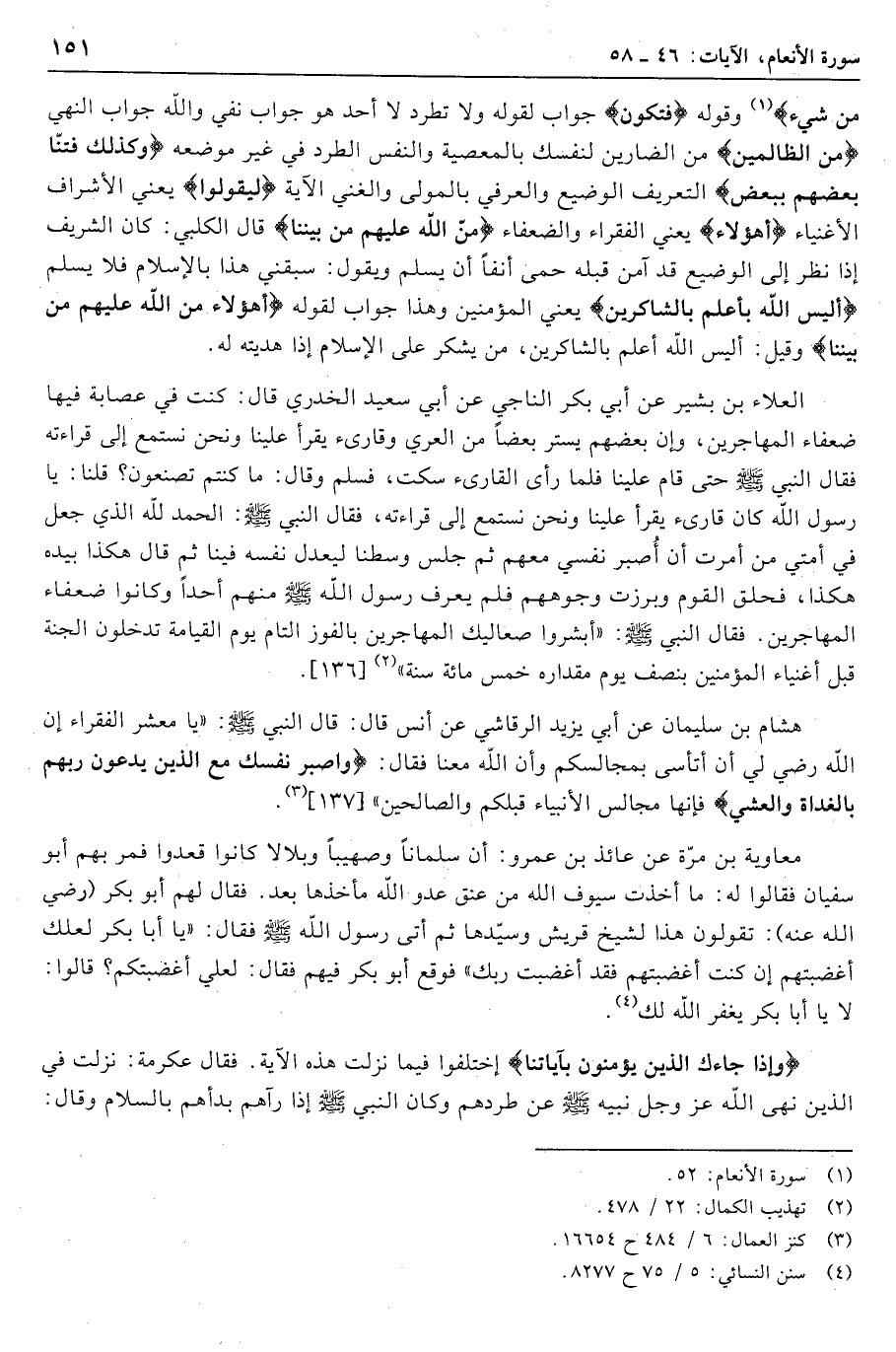 «1» وقوله فَتَكُونَ جواب لقوله وَلا تَطْرُدِ لا أحد هو جواب نفي والله جواب النهي مِنَ الظَّالِمِينَ من الضارين لنفسك بالمعصية والنفس الطرد في غير موضعه وَكَذلِكَ فَتَنَّا بَعْضَهُمْ بِبَعْضٍ التعريف الوضيع والعرفي بالمولى والغني الآية لِيَقُولُوا يعني الأشراف الأغنياء أَهؤُلاءِ يعني الفقراء والضعفاء مَنَّ اللَّهُ عَلَيْهِمْ مِنْ بَيْنِنا قال الكلبي: كان الشريف إذا نظر إلى الوضيع قد آمن قبله حمى أنفا أن يسلم ويقول: سبقني هذا بالإسلام فلا يسلم أَلَيْسَ اللَّهُ بِأَعْلَمَ بِالشَّاكِرِينَ يعني المؤمنين وهذا جواب لقوله أَهؤُلاءِ مَنَّ اللَّهُ عَلَيْهِمْ مِنْ بَيْنِنا وقيل: أليس الله أعلم بالشاكرين، من يشكر على الإسلام إذا هديته له.