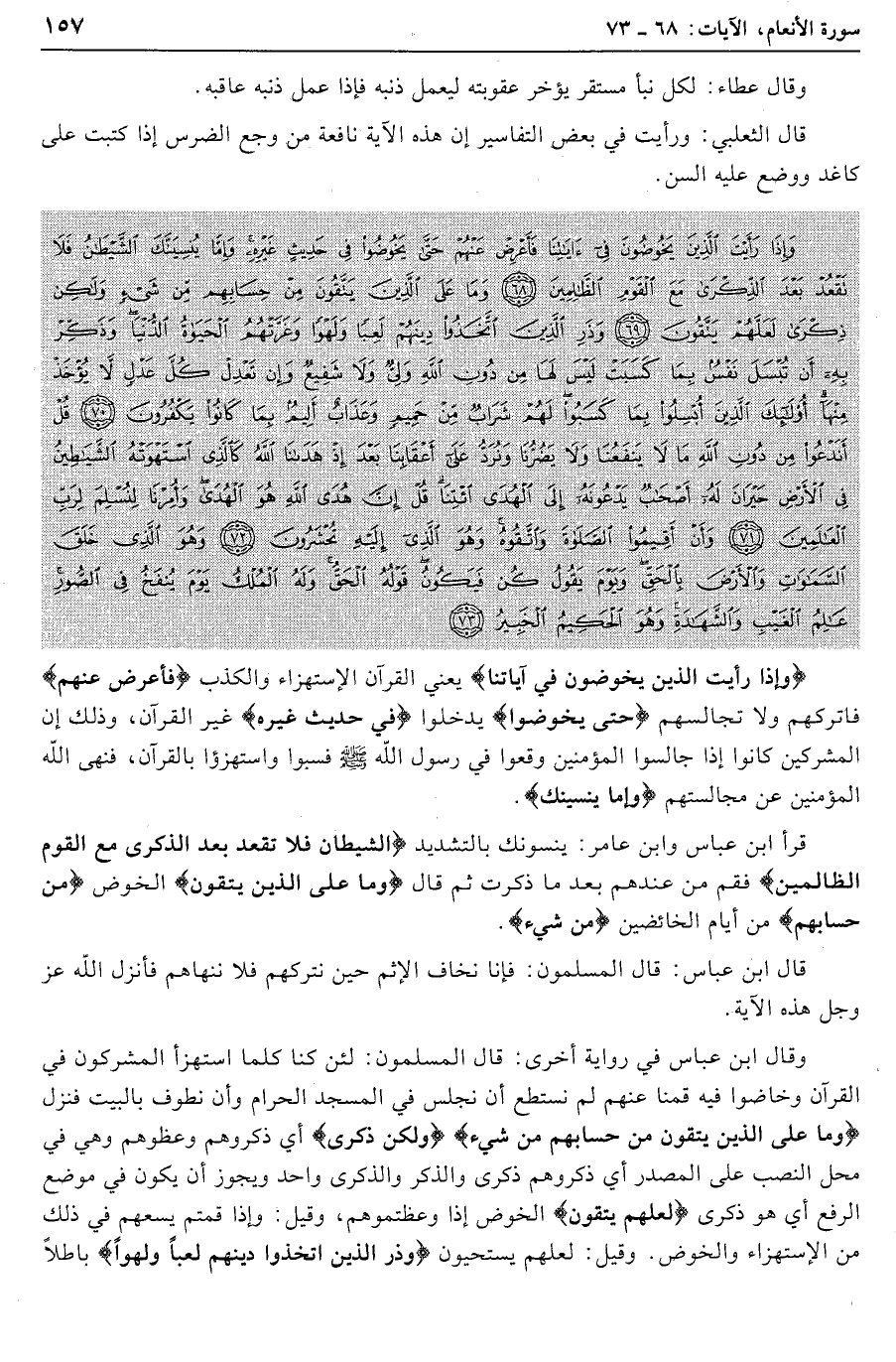 قرأ ابن عباس وابن عامر: ينسونك بالتشديد الشَّيْطانُ فَلا تَقْعُدْ بَعْدَ الذِّكْرى مَعَ الْقَوْمِ الظَّالِمِينَ فقم من عندهم بعد ما ذكرت ثم قال وَما عَلَى الَّذِينَ يَتَّقُونَ الخوض مِنْ حِسابِهِمْ من أيام الخائضين مِنْ شَيْءٍ.