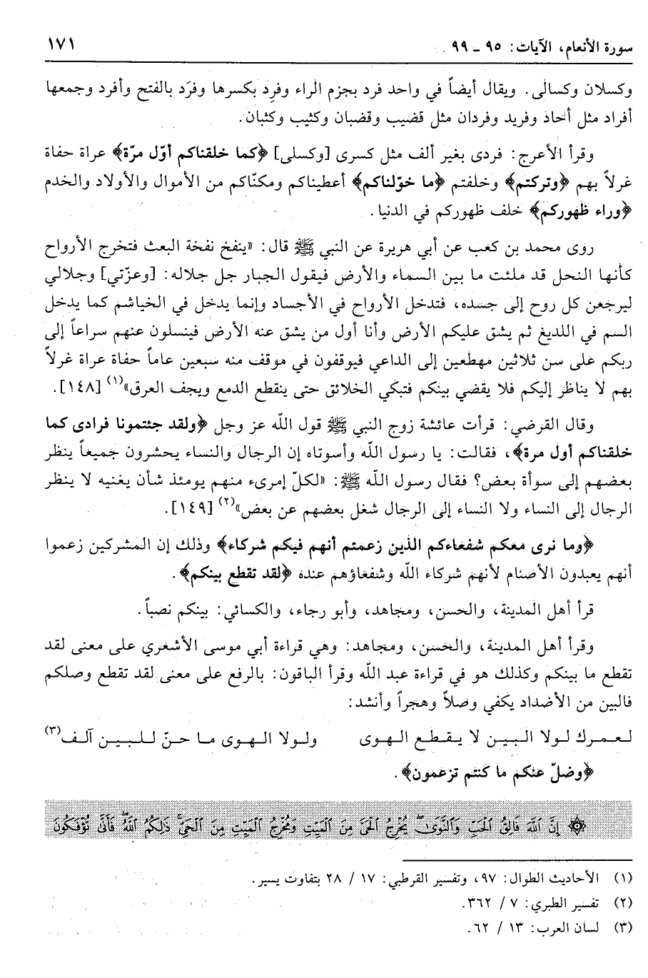 وقال القرضي: قرأت عائشة زوج النبي صلى الله عليه وسلّم قول الله عز وجل وَلَقَدْ جِئْتُمُونا فُرادى كَما خَلَقْناكُمْ أَوَّلَ مَرَّةٍ، فقالت: يا رسول الله واسوتاه إن الرجال والنساء يحشرون جميعا ينظر بعضهم إلى سوأة بعض؟ فقال رسول الله صلى الله عليه وسلّم: «لِكُلِّ امْرِئٍ مِنْهُمْ يَوْمَئِذٍ شَأْنٌ يُغْنِيهِ لا ينظر الرجال إلى النساء ولا النساء إلى الرجال شغل بعضهم عن بعض» «2» [149] .