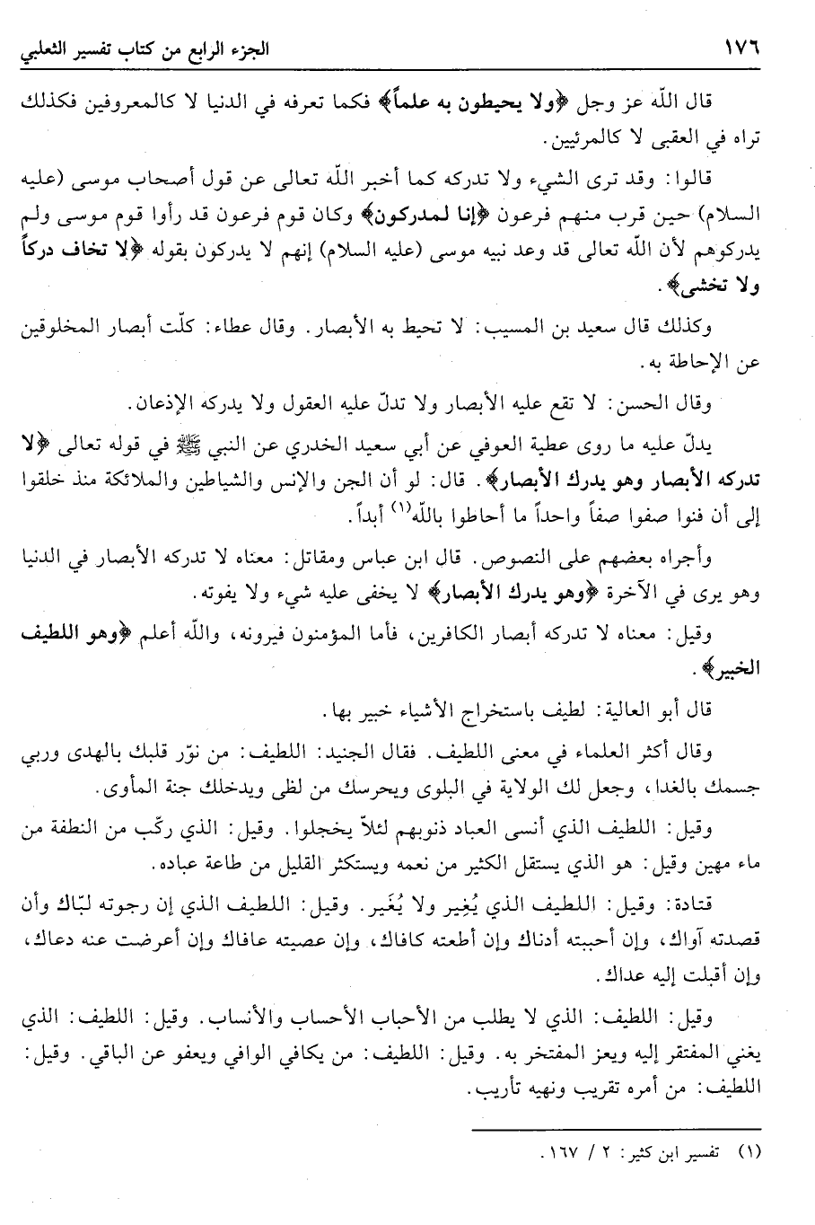 روى عطية العوفي عن أبي سعيد الخدري عن النبي صلى الله عليه وسلّم في قوله تعالى لا تُدْرِكُهُ الْأَبْصارُ وَهُوَ يُدْرِكُ الْأَبْصارَ. قال: لو أن الجن والإنس والشياطين والملائكة منذ خلقوا إلى أن فنوا صفوا صفا واحدا ما أحاطوا بالله «1» أبدا.