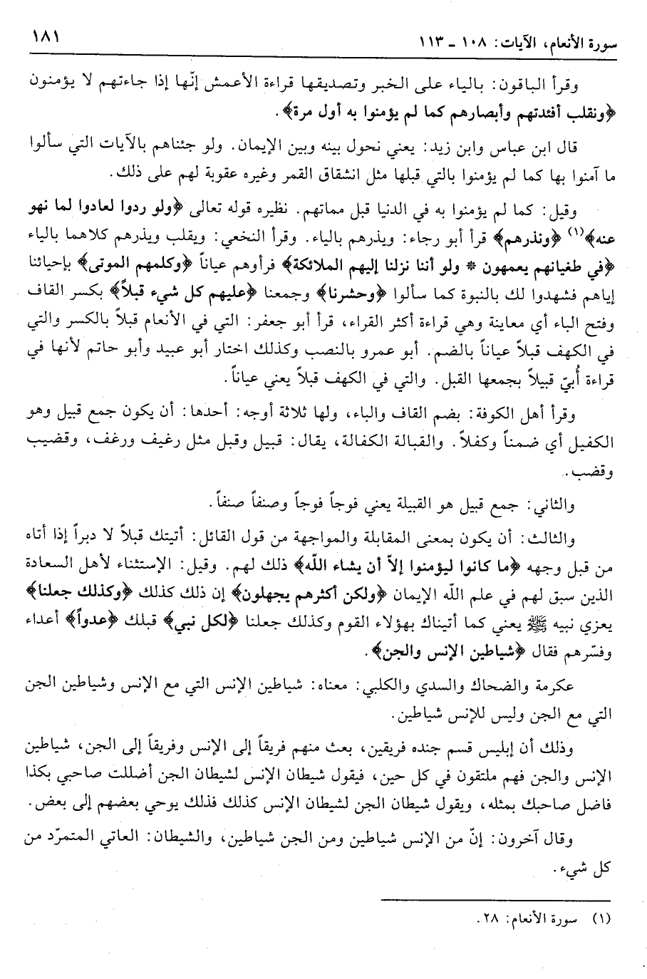 والثالث: أن يكون بمعنى المقابلة والمواجهة من قول القائل: أتيتك قبلا لا دبرا إذا أتاه من قبل وجهه ما كانُوا لِيُؤْمِنُوا إِلَّا أَنْ يَشاءَ اللَّهُ ذلك لهم. وقيل: الاستثناء لأهل السعادة الذين سبق لهم في علم الله الإيمان وَلكِنَّ أَكْثَرَهُمْ يَجْهَلُونَ إن ذلك كذلك وَكَذلِكَ جَعَلْنا يعزي نبيه صلى الله عليه وسلّم يعني كما أتيناك بهؤلاء القوم وكذلك جعلنا لِكُلِّ نَبِيٍّ قبلك عَدُوًّا أعداء وفسّرهم فقال شَياطِينَ الْإِنْسِ وَالْجِنِّ.