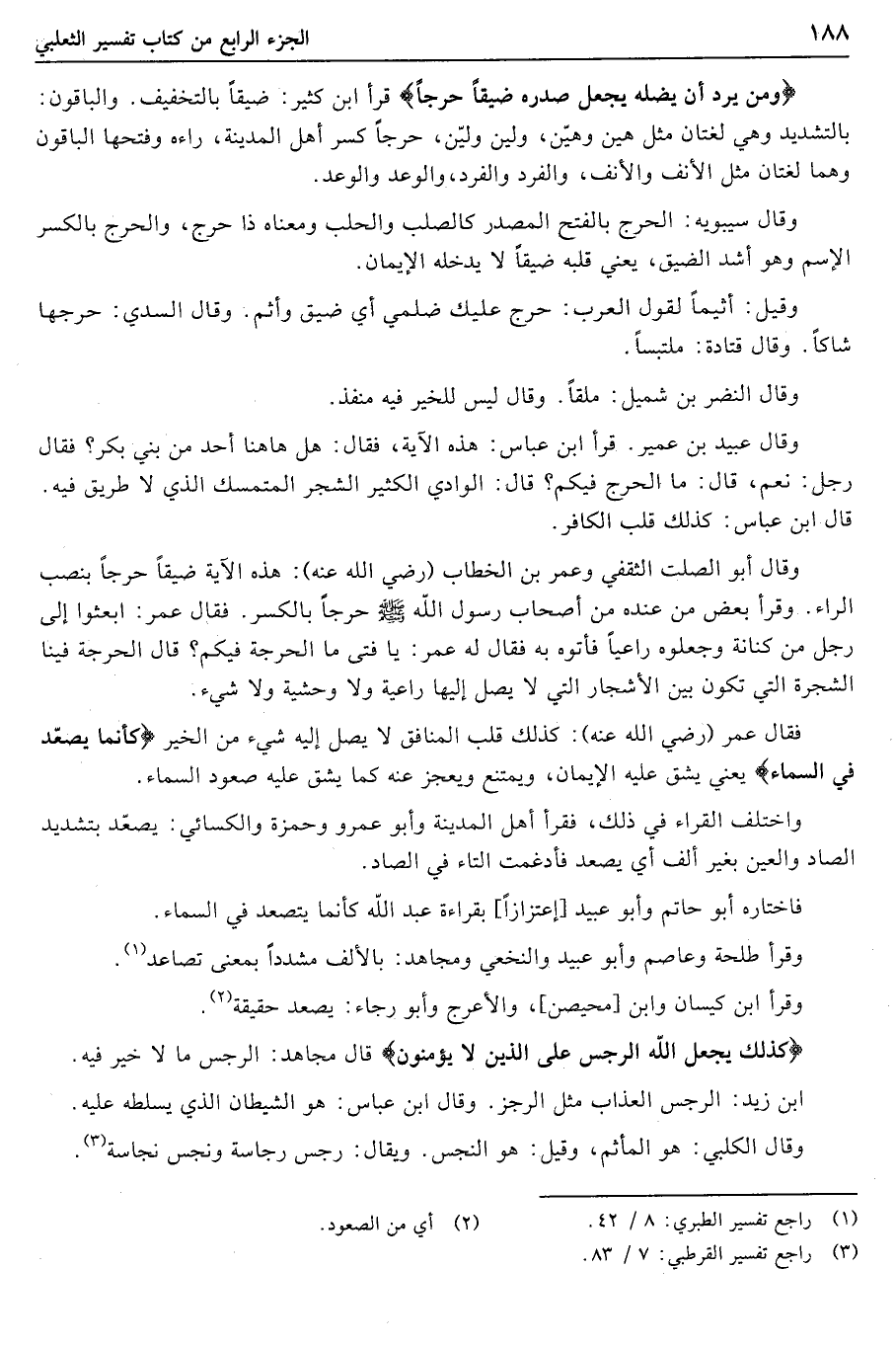 وقال أبو الصلت الثقفي وعمر بن الخطاب (رضي الله عنه) : هذه الآية ضَيِّقاً حَرَجاً بنصب الراء. وقرأ بعض من عنده من أصحاب رسول الله صلى الله عليه وسلّم حَرِجاً بالكسر. فقال عمر: ابعثوا إلى رجل من كنانة وجعلوه راعيا فأتوه به فقال له عمر: يا فتى ما الحرجة فيكم؟ قال الحرجة فينا الشجرة التي تكون بين الأشجار التي لا يصل إليها راعية ولا وحشية ولا شيء.