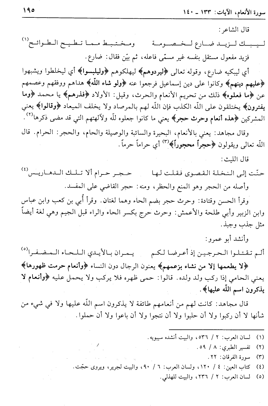 وقال مجاهد: يعني بالأنعام، البحيرة والسائبة والوصيلة والحام، والحجر: الحرام. قال الله تعالى ويقولون حِجْراً مَحْجُوراً «3» أي حراما حرما.