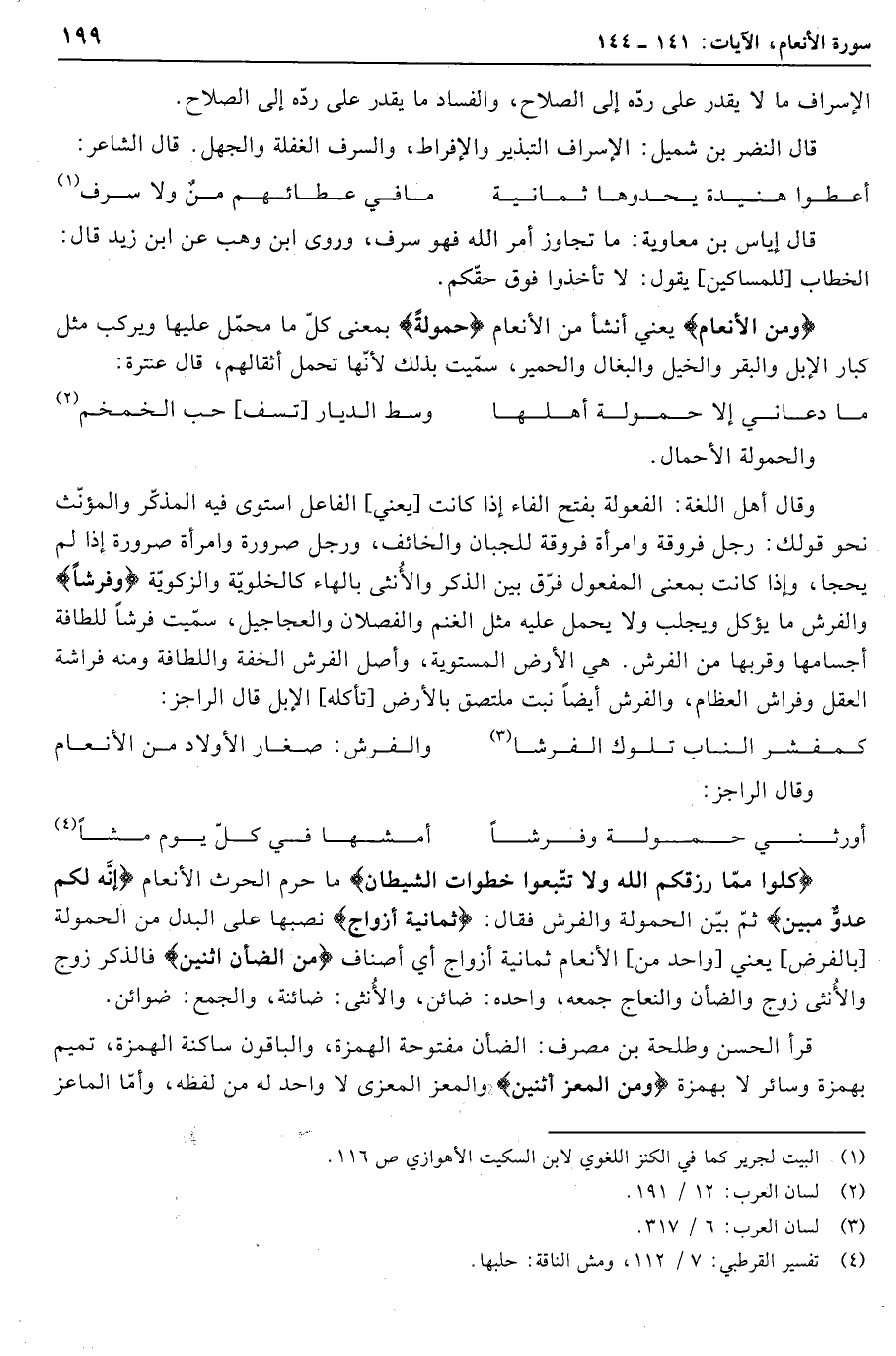 كُلُوا مِمَّا رَزَقَكُمُ اللَّهُ وَلا تَتَّبِعُوا خُطُواتِ الشَّيْطانِ ما حرم الحرث الأنعام إِنَّهُ لَكُمْ عَدُوٌّ مُبِينٌ ثمّ بيّن الحمولة والفرش فقال: ثَمانِيَةَ أَزْواجٍ نصبها على البدل من الحمولة [بالفرض] يعني [واحد من] الأنعام ثمانية أزواج أي أصناف مِنَ الضَّأْنِ اثْنَيْنِ فالذكر زوج والأنثى زوج والضأن والنعاج جمعه، واحده: ضائن، والأنثى: ضائنة، والجمع: ضوائن.