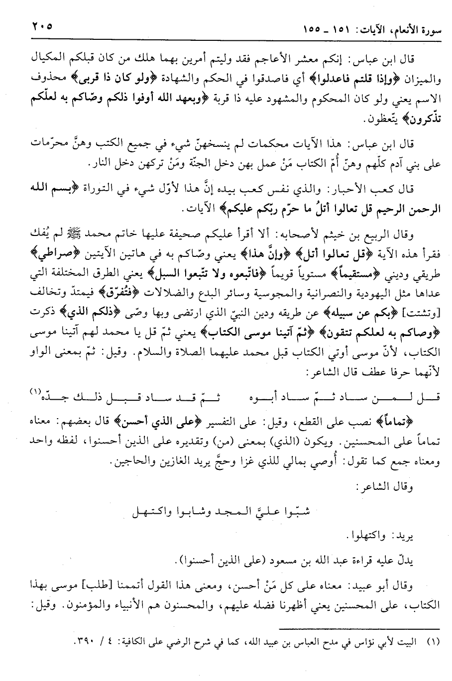 تَماماً نصب على القطع، وقيل: على التفسير عَلَى الَّذِي أَحْسَنَ قال بعضهم: معناه تماما على المحسنين. ويكون (الَّذِي) بمعنى (من) وتقديره على الذين أحسنوا، لفظه واحد ومعناه جمع كما تقول: أوصي بمالي للذي غزا وحجّ يريد الغازين والحاجين.