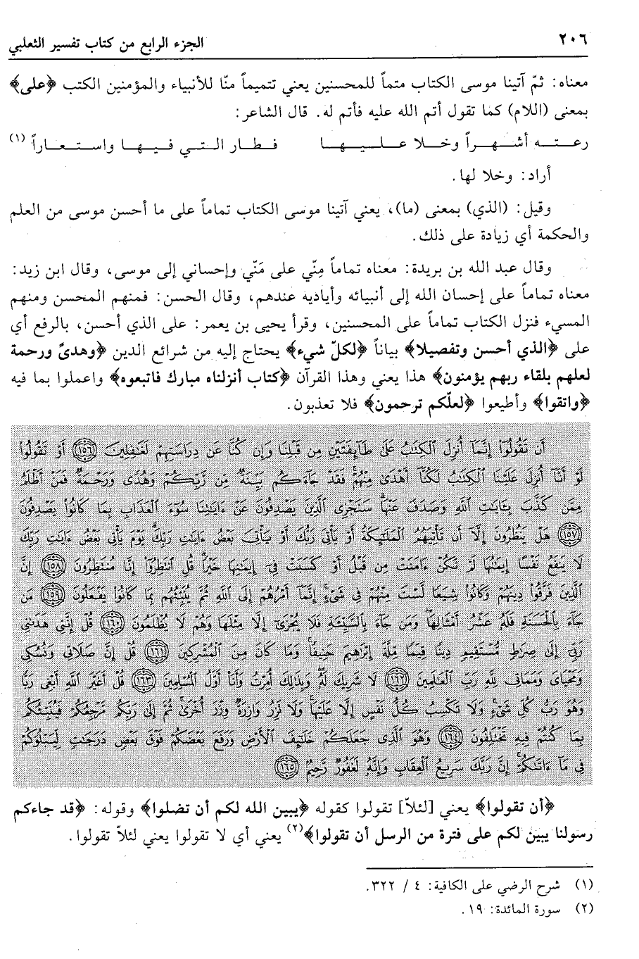 معناه: ثُمَّ آتَيْنا مُوسَى الْكِتابَ متما للمحسنين يعني تتميما منّا للأنبياء والمؤمنين الكتب (عَلَى) بمعنى (اللام) كما تقول أتم الله عليه فأتم له. قال الشاعر: