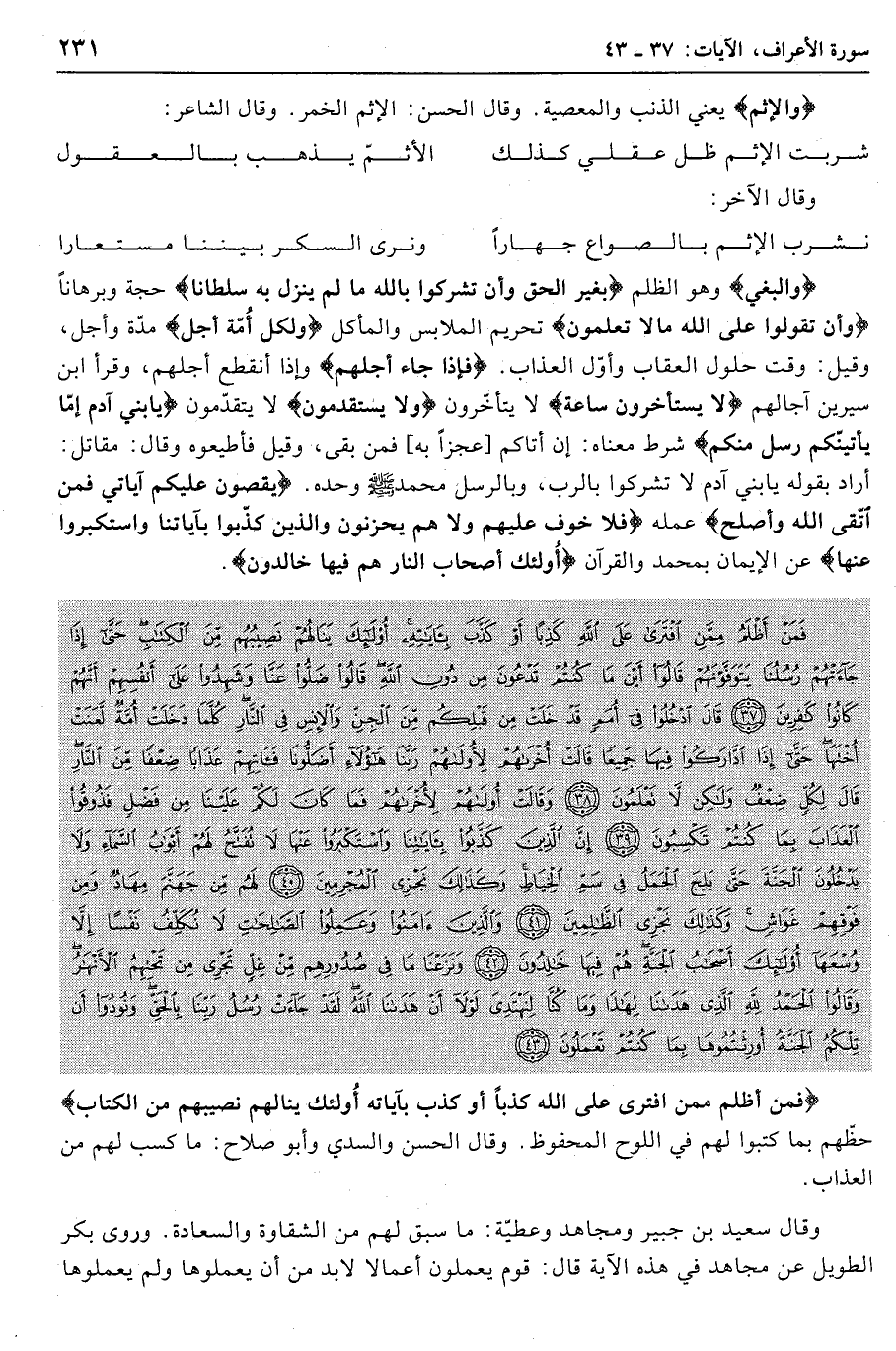 وَالْبَغْيَ وهو الظلم بِغَيْرِ الْحَقِّ وَأَنْ تُشْرِكُوا بِاللَّهِ ما لَمْ يُنَزِّلْ بِهِ سُلْطاناً حجة وبرهانا وَأَنْ تَقُولُوا عَلَى اللَّهِ ما لا تَعْلَمُونَ تحريم الملابس والمأكل وَلِكُلِّ أُمَّةٍ أَجَلٌ مدّة وأجل، وقيل: وقت حلول العقاب وأوّل العذاب. فَإِذا جاءَ أَجَلُهُمْ وإذا انقطع أجلهم، وقرأ ابن سيرين آجالهم لا يَسْتَأْخِرُونَ ساعَةً لا يتأخّرون وَلا يَسْتَقْدِمُونَ لا يتقدّمون يا بَنِي آدَمَ إِمَّا يَأْتِيَنَّكُمْ رُسُلٌ مِنْكُمْ شرط معناه: إن أتاكم [عجزا به] فمن بقي، وقيل فأطيعوه وقال: مقاتل: