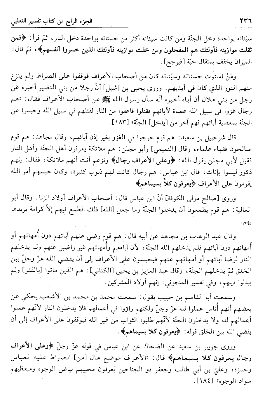 وروى جويبر بن سعيد عن الضحاك عن ابن عباس في قوله عزّ وجلّ وَعَلَى الْأَعْرافِ رِجالٌ يَعْرِفُونَ كُلًّا بِسِيماهُمْ قال: «الأعراف موضع عال [من] الصراط عليه العباس وحمزة، وعليّ بن أبي طالب وجعفر ذو الجناحين يعرفون محبيهم بياض الوجوه ومبغضيهم سواد الوجوه» [184] .