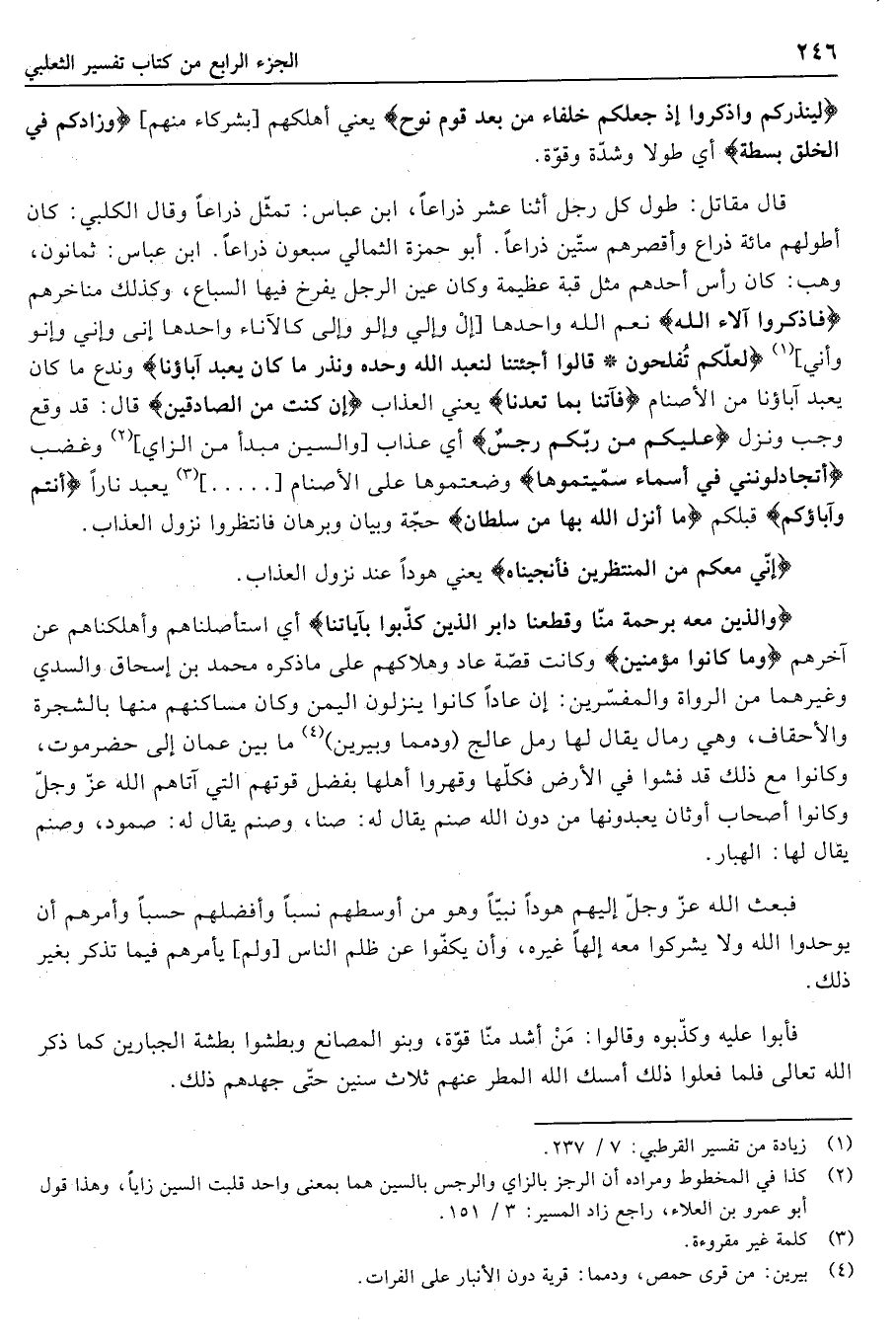 قال مقاتل: طول كل رجل اثنا عشر ذراعا، ابن عباس: تمثّل ذراعا وقال الكلبي: كان أطولهم مائة ذراع وأقصرهم ستّين ذراعا. أبو حمزة الثمالي سبعون ذراعا. ابن عباس: ثمانون، وهب: كان رأس أحدهم مثل قبة عظيمة وكان عين الرجل يفرخ فيها السباع، وكذلك مناخرهم فَاذْكُرُوا آلاءَ اللَّهِ نعم الله واحدها [إل وإلي وإلو وإلى كالآناء واحدها إنى وإني وإنو وأني] «1» لَعَلَّكُمْ تُفْلِحُونَ قالُوا أَجِئْتَنا لِنَعْبُدَ اللَّهَ وَحْدَهُ وَنَذَرَ ما كانَ يَعْبُدُ آباؤُنا وندع ما كان يعبد آباؤنا من الأصنام فَأْتِنا بِما تَعِدُنا يعني العذاب إِنْ كُنْتَ مِنَ الصَّادِقِينَ قالَ قَدْ وَقَعَ وجب ونزل عَلَيْكُمْ مِنْ رَبِّكُمْ رِجْسٌ أي عذاب [والسين مبدأ من الزاي] «2» وَغَضَبٌ أَتُجادِلُونَنِي فِي أَسْماءٍ سَمَّيْتُمُوها وضعتموها على الأصنام [ ... ] «3» يعبد نارا أَنْتُمْ وَآباؤُكُمْ قبلكم ما نَزَّلَ اللَّهُ بِها مِنْ سُلْطانٍ حجّة وبيان وبرهان فانتظروا نزول العذاب.