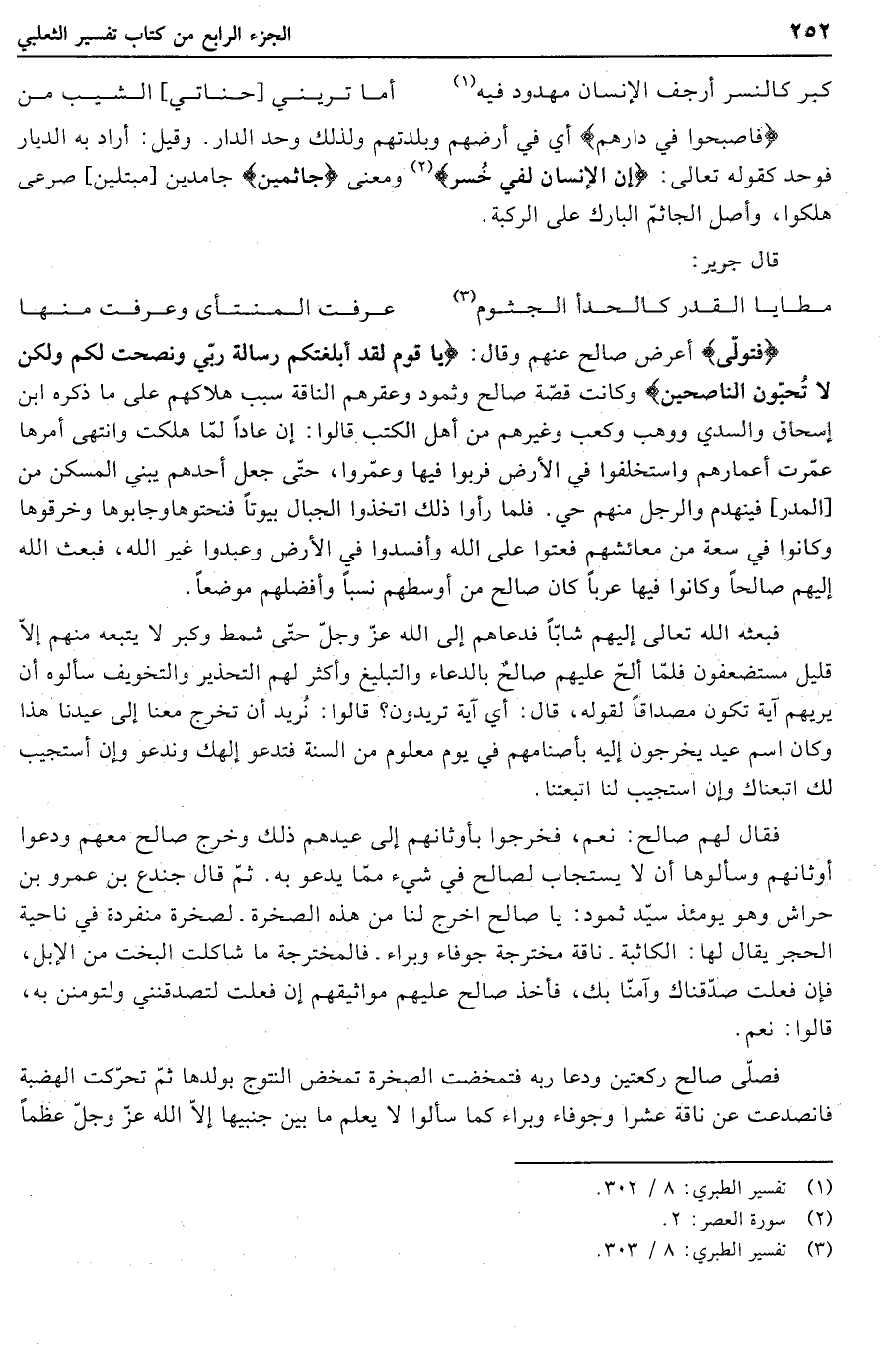 فَتَوَلَّى أعرض صالح عَنْهُمْ وَقالَ: يا قَوْمِ لَقَدْ أَبْلَغْتُكُمْ رِسالَةَ رَبِّي وَنَصَحْتُ لَكُمْ وَلكِنْ لا تُحِبُّونَ النَّاصِحِينَ وكانت قصّة صالح وثمود وعقرهم الناقة سبب هلاكهم على ما ذكره ابن إسحاق والسدي ووهب وكعب وغيرهم من أهل الكتب قالوا: إن عادا لمّا هلكت وانتهى أمرها عمّرت أعمارهم واستخلفوا في الأرض فربوا فيها وعمّروا، حتّى جعل أحدهم يبني المسكن من [المدر] فينهدم والرجل منهم حي. فلما رأوا ذلك اتخذوا الجبال بيوتا فنحتوها وجابوها وخرقوها وكانوا في سعة من معائشهم فعتوا على الله وأفسدوا في الأرض وعبدوا غير الله، فبعث الله إليهم صالحا وكانوا فيها عربا كان صالح من أوسطهم نسبا وأفضلهم موضعا.
