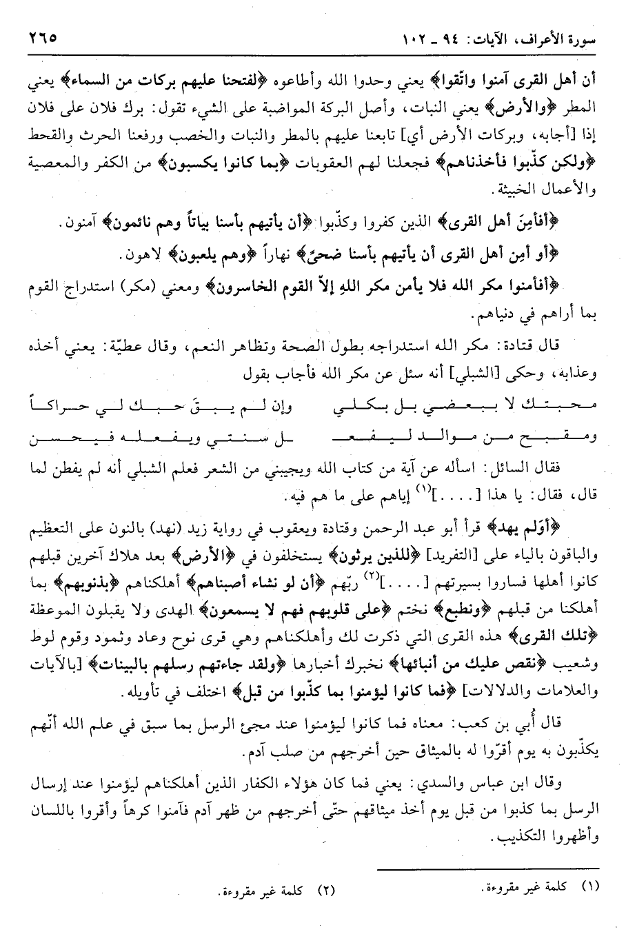 أَوَلَمْ يَهْدِ قرأ أبو عبد الرحمن وقتادة ويعقوب في رواية زيد (نهد) بالنون على التعظيم والباقون بالياء على [التفريد] لِلَّذِينَ يَرِثُونَ يستخلفون في الْأَرْضَ بعد هلاك آخرين قبلهم كانوا أهلها فساروا بسيرتهم [ ... ] «2» ربّهم أَنْ لَوْ نَشاءُ أَصَبْناهُمْ أهلكناهم بِذُنُوبِهِمْ بما أهلكنا من قبلهم وَنَطْبَعُ نختم عَلى قُلُوبِهِمْ فَهُمْ لا يَسْمَعُونَ الهدى ولا يقبلون الموعظة تِلْكَ الْقُرى هذه القرى التي ذكرت لك وأهلكناهم وهي قرى نوح وعاد وثمود وقوم لوط وشعيب نَقُصُّ عَلَيْكَ مِنْ أَنْبائِها نخبرك أخبارها وَلَقَدْ جاءَتْهُمْ رُسُلُهُمْ بِالْبَيِّناتِ [بالآيات والعلامات والدلالات] فَما كانُوا لِيُؤْمِنُوا بِما كَذَّبُوا مِنْ قَبْلُ اختلف في تأويله.