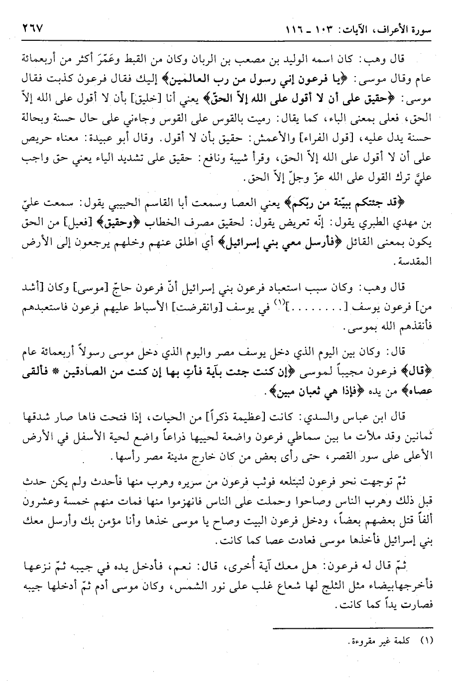 قال وهب: كان اسمه الوليد بن مصعب بن الربان وكان من القبط وعمّر أكثر من أربعمائة عام وقال موسى: يا فِرْعَوْنُ إِنِّي رَسُولٌ مِنْ رَبِّ الْعالَمِينَ إليك فقال فرعون كذبت فقال موسى: حَقِيقٌ عَلى أَنْ لا أَقُولَ عَلَى اللَّهِ إِلَّا الْحَقَّ يعني أنا [خليق] بأن لا أقول على الله إلّا الحق، فعلى بمعنى الباء، كما يقال: رميت بالقوس على القوس وجاءني على حال حسنة وبحالة حسنة يدل عليه، [قول الفراء] والأعمش: حقيق بأن لا أقول. وقال أبو عبيدة: معناه حريص على أن لا أقول على الله إلّا الحق، وقرأ شيبة ونافع: حقيّق على تشديد الياء يعني حق واجب عليّ ترك القول على الله عزّ وجلّ إلّا الحق.