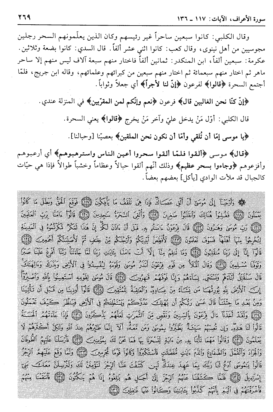 قالَ موسى أَلْقُوا فَلَمَّا أَلْقَوْا سَحَرُوا أَعْيُنَ النَّاسِ وَاسْتَرْهَبُوهُمْ أي أرعبوهم وأفزعوهم وَجاؤُ بِسِحْرٍ عَظِيمٍ وذلك أنّهم ألقوا حبالا وعظاما وخشبا طوالا فإذا هي حيّات كالجبال قد ملأت الوادي [يأكل] بعضهم بعضا.