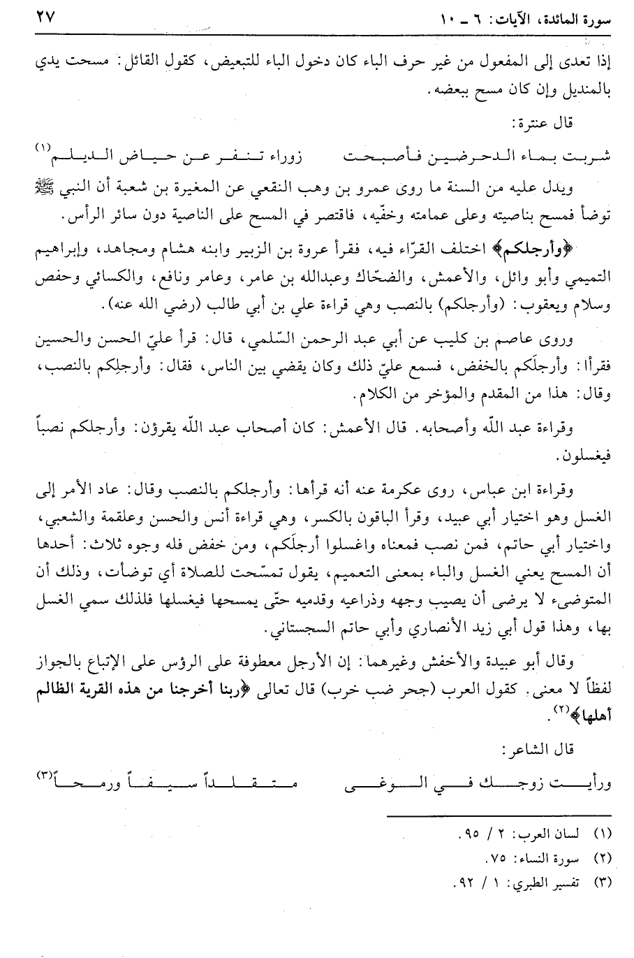 وقراءة ابن عباس، روى عكرمة عنه أنه قرأها: وَأَرْجُلَكُمْ بالنصب وقال: عاد الأمر إلى الغسل وهو اختيار أبي عبيد، وقرأ الباقون بالكسر، وهي قراءة أنس والحسن وعلقمة والشعبي، واختيار أبي حاتم، فمن نصب فمعناه واغسلوا أرجلكم، ومن خفض فله وجوه ثلاث: أحدها أن المسح يعني الغسل والباء بمعنى التعميم، يقول تمسّحت للصلاة أي توضأت، وذلك أن المتوضئ لا يرضى أن يصيب وجهه وذراعيه وقدميه حتّى يمسحها فيغسلها فلذلك سمي الغسل بها، وهذا قول أبي زيد الأنصاري وأبي حاتم السجستاني.