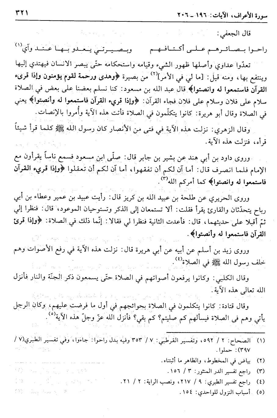 تعدّوا عداوي وأصلها ظهور الشيء وقيامه واستحكامه حتّى يبصر الإنسان فيهتدي إليها وينتفع بها، ومنه قيل: [ما لي في الأمر] «2» من بصيرة وَهُدىً وَرَحْمَةٌ لِقَوْمٍ يُؤْمِنُونَ وَإِذا قُرِئَ الْقُرْآنُ فَاسْتَمِعُوا لَهُ وَأَنْصِتُوا قال عبد الله بن مسعود: كنا نسلم بعضنا على بعض في الصلاة سلام على فلان وسلام على فلان فجاء القرآن: وَإِذا قُرِئَ الْقُرْآنُ فَاسْتَمِعُوا لَهُ وَأَنْصِتُوا يعني في الصلاة وقال أبو هريرة: كانوا يتكلّمون في الصلاة فأتت هذه الآية وأمروا بالإنصات.