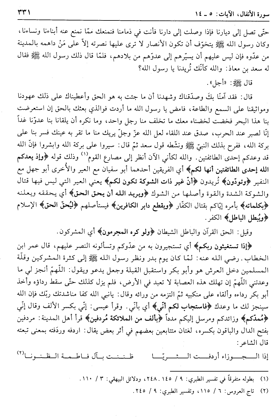 «1» وذلك قوله وَإِذْ يَعِدُكُمُ اللَّهُ إِحْدَى الطَّائِفَتَيْنِ أَنَّها لَكُمْ أي الفريقين أحدهما أبو سفيان مع العير والأخرى أبو جهل مع النفير وَتَوَدُّونَ تريدون أَنَّ غَيْرَ ذاتِ الشَّوْكَةِ تَكُونُ لَكُمْ يعني العير التي ليس فيها قتال والشوكة الشدة والقوة وأصلها من الشوك وَيُرِيدُ اللَّهُ أَنْ يُحِقَّ الْحَقَّ أي يحققه ويعلنه بِكَلِماتِهِ بأمره إيّاكم بقتال الكفّار وَيَقْطَعَ دابِرَ الْكافِرِينَ فيستأصلهم لِيُحِقَّ الْحَقَّ الإسلام وَيُبْطِلَ الْباطِلَ الكفر.