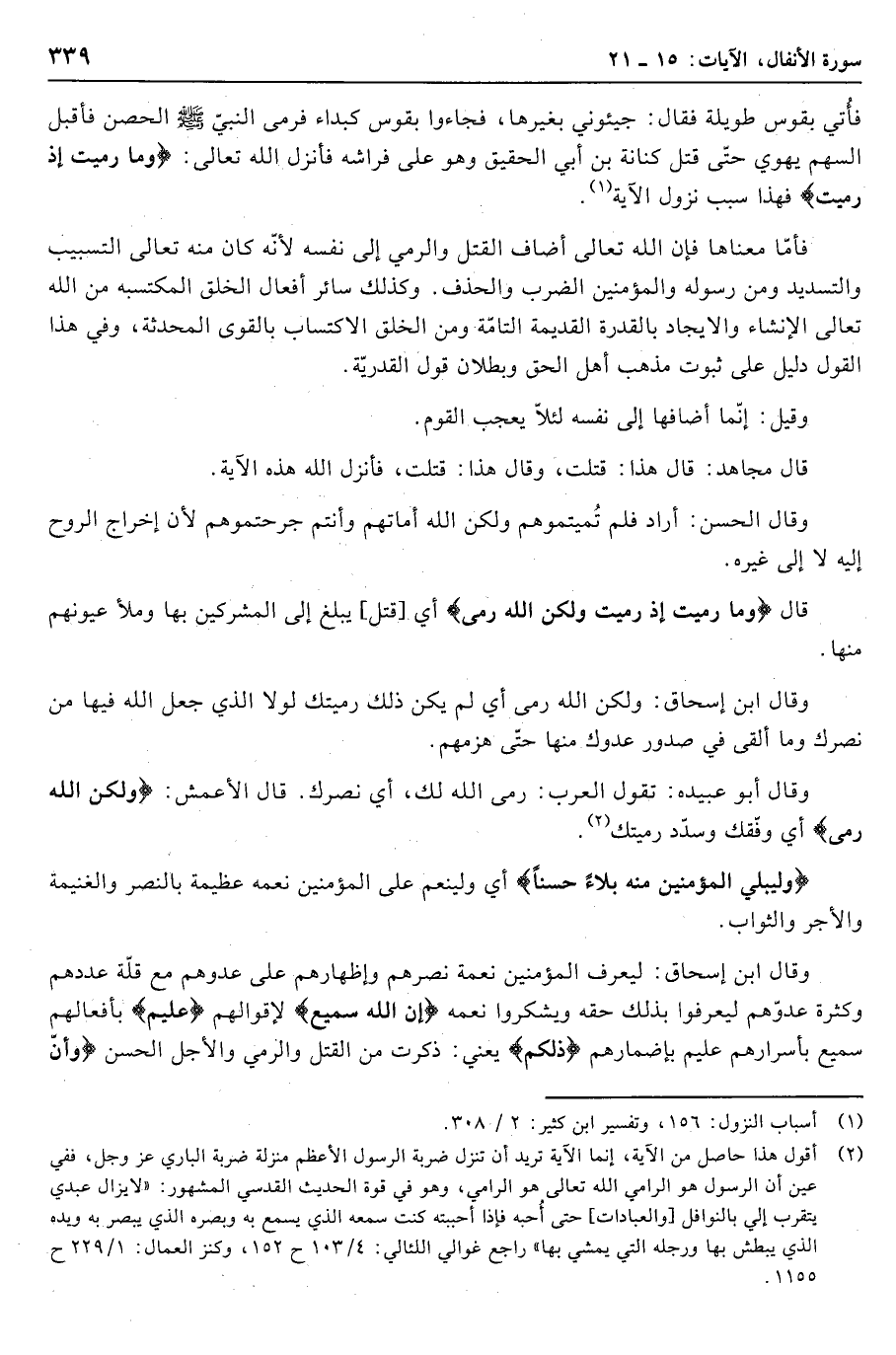 فأمّا معناها فإن الله تعالى أضاف القتل والرمي إلى نفسه لأنّه كان منه تعالى التسبيب والتسديد ومن رسوله والمؤمنين الضرب والحذف. وكذلك سائر أفعال الخلق المكتسبة من الله تعالى الإنشاء والإيجاد بالقدرة القديمة التامّة ومن الخلق الاكتساب بالقوى المحدثة، وفي هذا القول دليل على ثبوت مذهب أهل الحق وبطلان قول القدريّة.