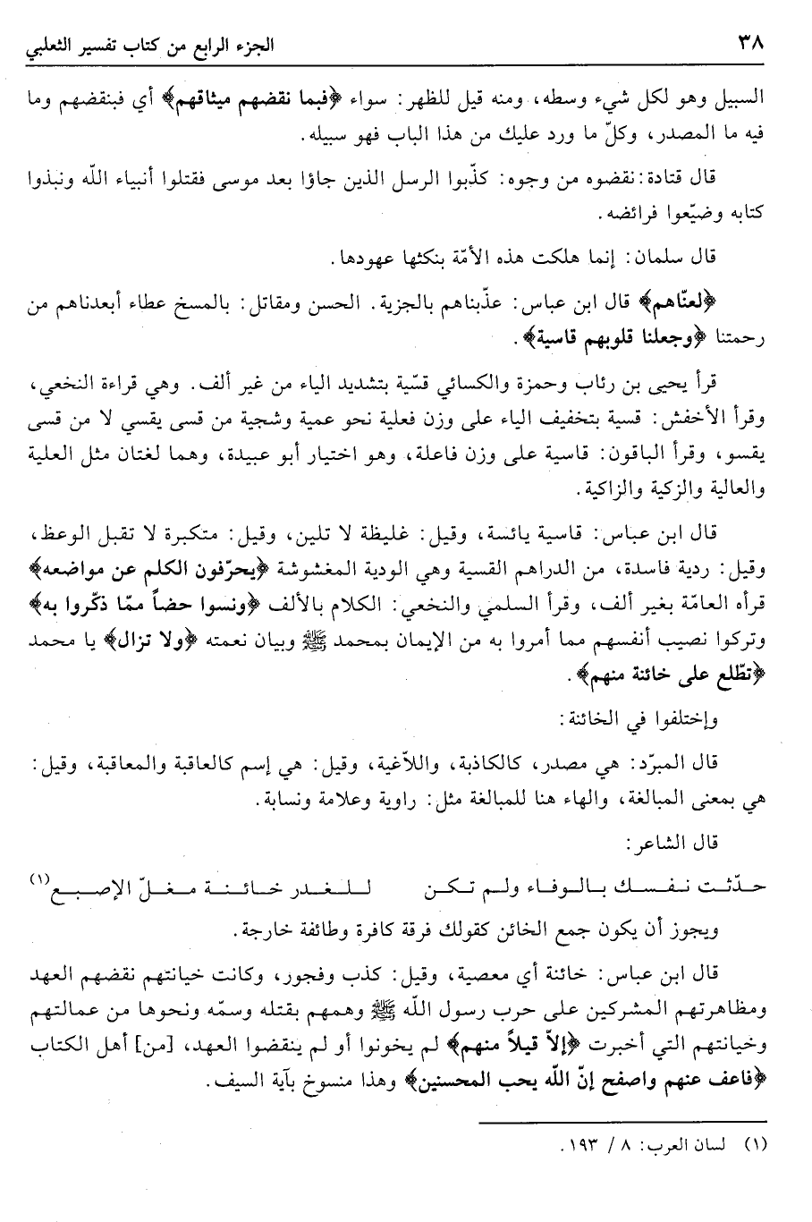 قال ابن عباس: خائنة أي معصية، وقيل: كذب وفجور، وكانت خيانتهم نقضهم العهد ومظاهرتهم المشركين على حرب رسول الله صلى الله عليه وسلّم وهمهم بقتله وسمّه ونحوها من عمالتهم وخيانتهم التي أخبرت إِلَّا قَلِيلًا مِنْهُمْ لم يخونوا أو لم ينقضوا العهد، [من] أهل الكتاب فَاعْفُ عَنْهُمْ وَاصْفَحْ إِنَّ اللَّهَ يُحِبُّ الْمُحْسِنِينَ وهذا منسوخ بآية السيف.