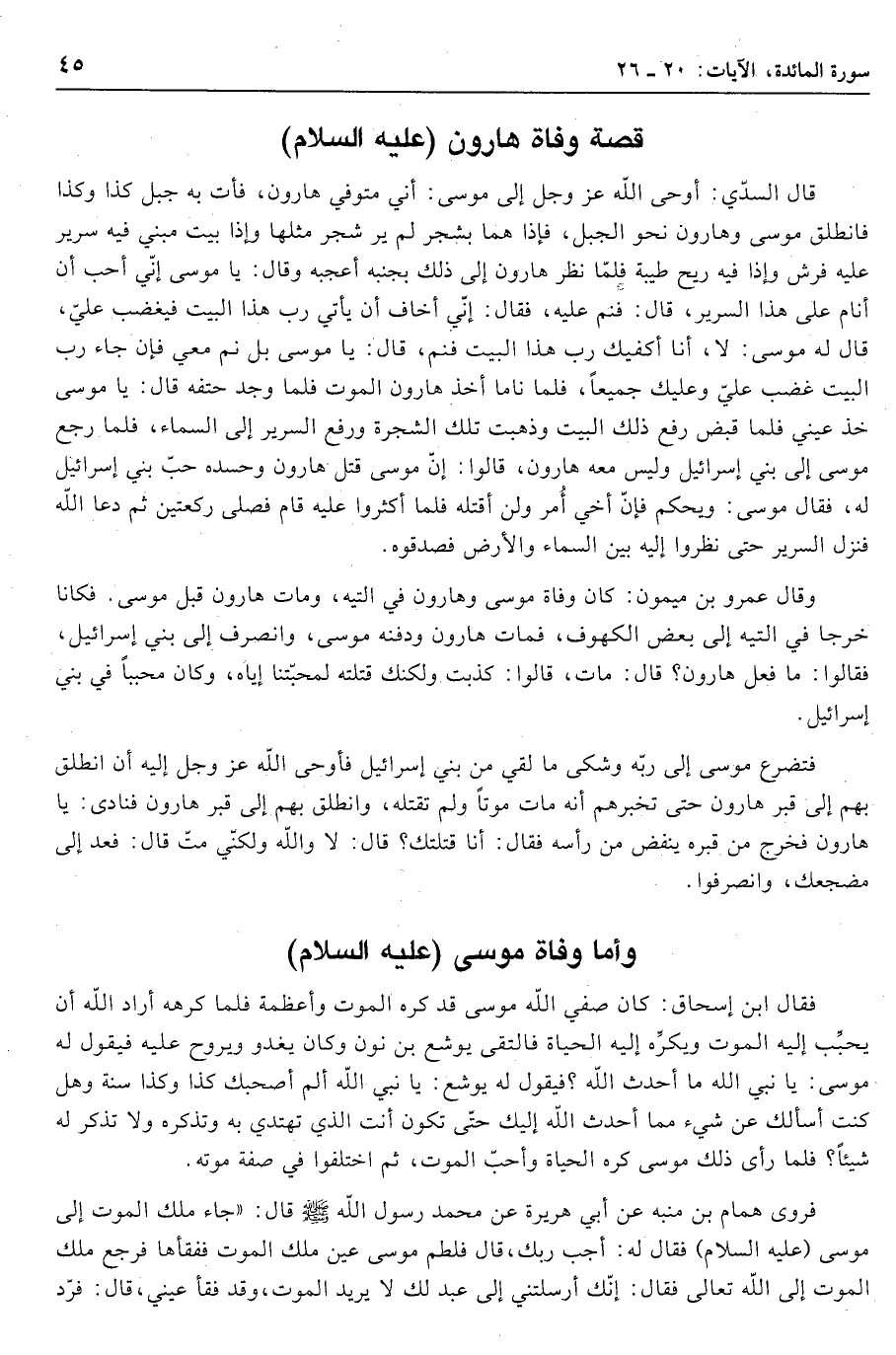 قال السدّي: أوحى الله عز وجل إلى موسى: أني متوفي هارون، فأت به جبل كذا وكذا فانطلق موسى وهارون نحو الجبل، فإذا هما بشجر لم ير شجر مثلها وإذا بيت مبني فيه سرير عليه فرش وإذا فيه ريح طيبة فلمّا نظر هارون إلى ذلك بجنبه أعجبه وقال: يا موسى إنّي أحب أن أنام على هذا السرير، قال: فنم عليه، فقال: إنّي أخاف أن يأتي رب هذا البيت فيغضب عليّ، قال له موسى: لا، أنا أكفيك رب هذا البيت فنم، قال: يا موسى بل نم معي فإن جاء رب البيت غضب عليّ وعليك جميعا، فلما ناما أخذ هارون الموت فلما وجد حتفه قال: يا موسى خذ عيني فلما قبض رفع ذلك البيت وذهبت تلك الشجرة ورفع السرير إلى السماء، فلما رجع موسى إلى بني إسرائيل وليس معه هارون، قالوا: إنّ موسى قتل هارون وحسده حبّ بني إسرائيل له، فقال موسى: ويحكم فإنّ أخي أمر ولن أقتله فلما أكثروا عليه قام فصلى ركعتين ثم دعا الله فنزل السرير حتى نظروا إليه بين السماء والأرض فصدقوه.