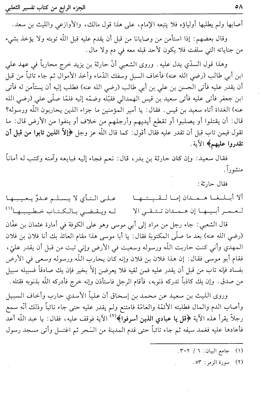 وروى الليث بن سعيد عن محمد بن إسحاق أن عليا الأسدي حارب وأخاف السبيل وأصاب الدم والمال فطلبته الأئمّة والعامّة فامتنع ولم يقدر عليه حتى جاء تائبا وذلك أنّه سمع رجلا يقرأ هذه الآية قُلْ يا عِبادِيَ الَّذِينَ أَسْرَفُوا «2» الآية فوقف عليه، فقال: يا عبد الله أعد فأعادها عليه فغمد سيفه ثم جاء تائبا حتى قدم المدينة من السحر ثم اغتسل وأتى مسجد رسول