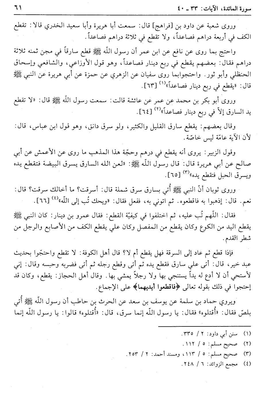 فقال عمرو بن دينار: كان النبي صلى الله عليه وسلّم يقطع اليد من الكوع وكان يقطع من المفصل وكان علي يقطع الكف من الأصابع والرجل من شطر القدم.