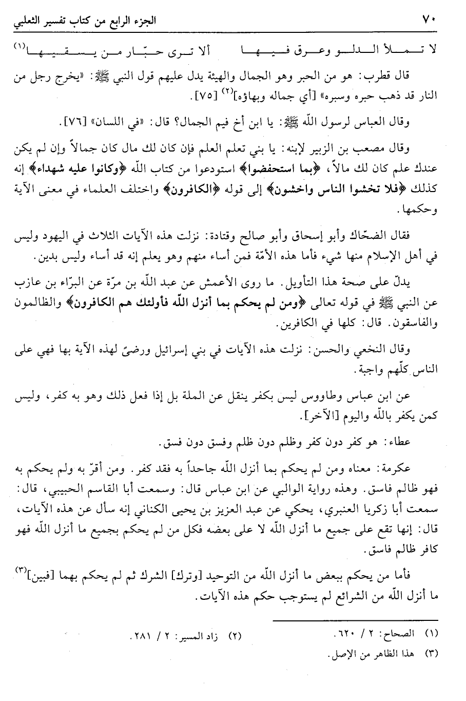روى الأعمش عن عبد الله بن مرّة عن البراء بن عازب عن النبي صلى الله عليه وسلّم في قوله تعالى وَمَنْ لَمْ يَحْكُمْ بِما أَنْزَلَ اللَّهُ فَأُولئِكَ هُمُ الْكافِرُونَ والظَّالِمُونَ والْفاسِقُونَ. قال: كلها في الكافرين.