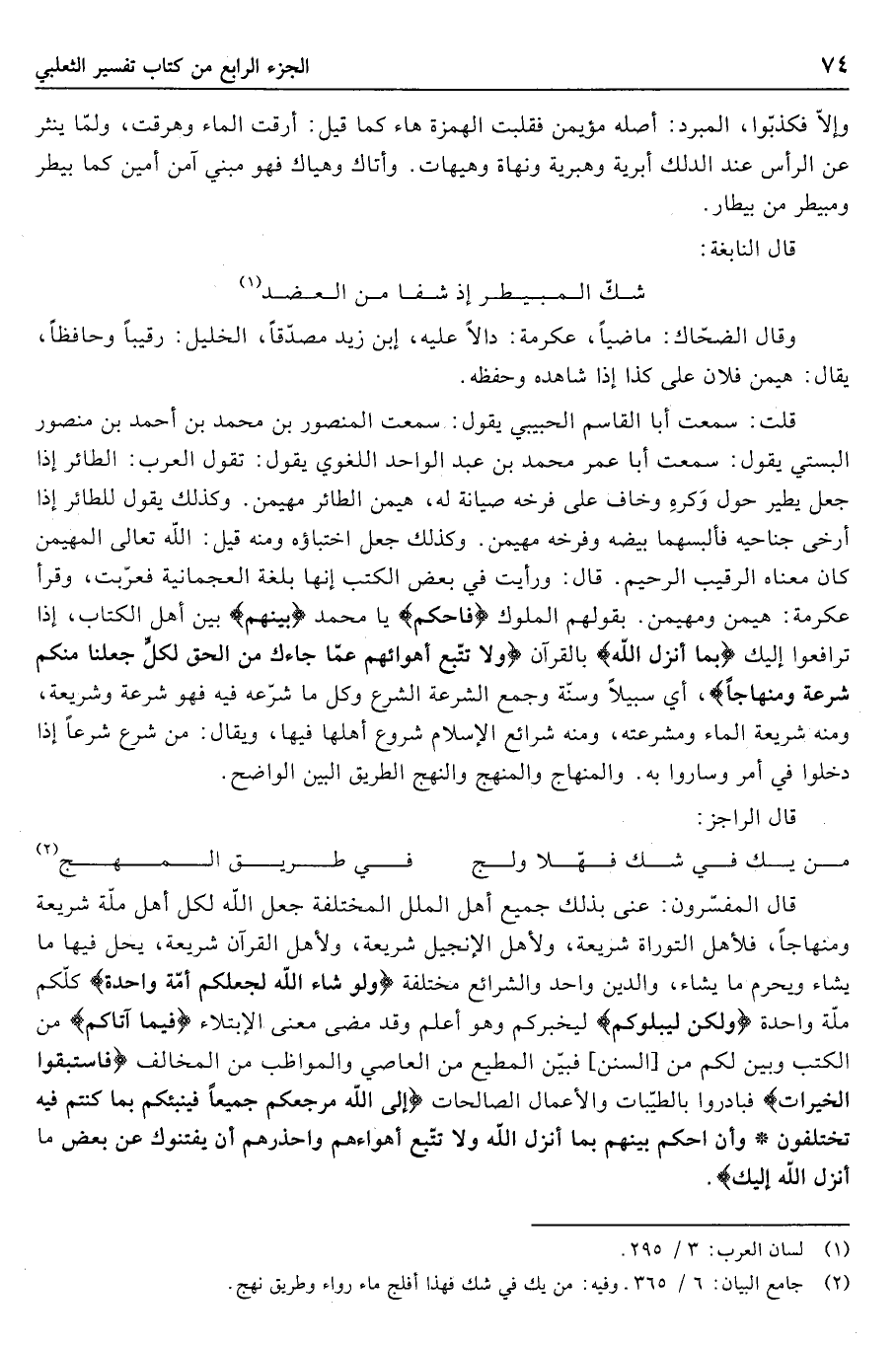 قلت: سمعت أبا القاسم الحبيبي يقول: سمعت المنصور بن محمد بن أحمد بن منصور البستي يقول: سمعت أبا عمر محمد بن عبد الواحد اللغوي يقول: تقول العرب: الطائر إذا جعل يطير حول وكره وخاف على فرخه صيانة له، هيمن الطائر مهيمن. وكذلك يقول للطائر إذا أرخى جناحيه فألبسهما بيضه وفرخه مهيمن. وكذلك جعل اختباؤه ومنه قيل: الله تعالى المهيمن كان معناه الرقيب الرحيم. قال: ورأيت في بعض الكتب إنها بلغة العجمانية فعرّبت، وقرأ عكرمة: هيمن ومهيمن. بقولهم الملوك فَاحْكُمْ يا محمد بَيْنَهُمْ بين أهل الكتاب، إذا ترافعوا إليك بِما أَنْزَلَ اللَّهُ بالقرآن وَلا تَتَّبِعْ أَهْواءَهُمْ عَمَّا جاءَكَ مِنَ الْحَقِّ لِكُلٍّ جَعَلْنا مِنْكُمْ شِرْعَةً وَمِنْهاجاً، أي سبيلا وسنّة وجمع الشرعة الشرع وكل ما شرّعه فيه فهو شرعة وشريعة، ومنه شريعة الماء ومشرعته، ومنه شرائع الإسلام شروع أهلها فيها، ويقال: من شرع شرعا إذا دخلوا في أمر وساروا به. والمنهاج والمنهج والنهج الطريق البين الواضح.