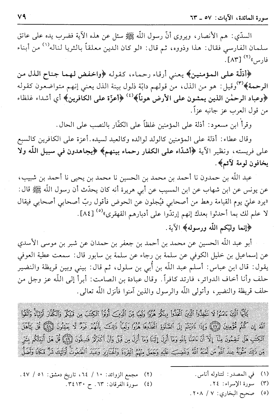 أبو عبد الله الحسين عن محمد بن أحمد بن جعفر بن حمدان عن شبر بن موسى الأسدي عن إسماعيل بن خليل الكوفي عن سلمة بن رجاء عن سلمة بن سابور قال: سمعت عطية العوفي يقول: قال ابن عباس: أسلم عبد الله بن أبي بن سلول، ثم قال: بيني وبين قريظة والنضير حلف وأنا أخاف الدوائر، فارتد كافرا. وقال عبادة بن الصامت: أبرأ إلى الله عز وجل من حلف قريظة والنضير، وأتولى الله والرسول والذين آمنوا فأنزل الله تعالى.