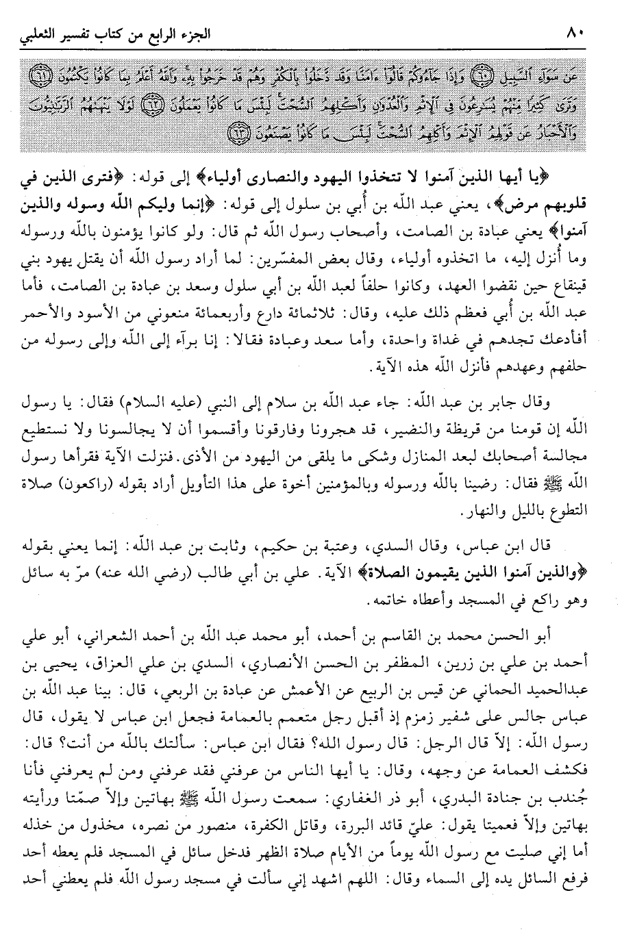 يا أَيُّهَا الَّذِينَ آمَنُوا لا تَتَّخِذُوا الْيَهُودَ وَالنَّصارى أَوْلِياءَ إلى قوله: فَتَرَى الَّذِينَ فِي قُلُوبِهِمْ مَرَضٌ، يعني عبد الله بن أبي بن سلول إلى قوله: إِنَّما وَلِيُّكُمُ اللَّهُ وَرَسُولُهُ وَالَّذِينَ آمَنُوا يعني عبادة بن الصامت، وأصحاب رسول الله ثم قال: ولو كانوا يؤمنون بالله ورسوله وما أنزل إليه، ما اتخذوه أولياء،