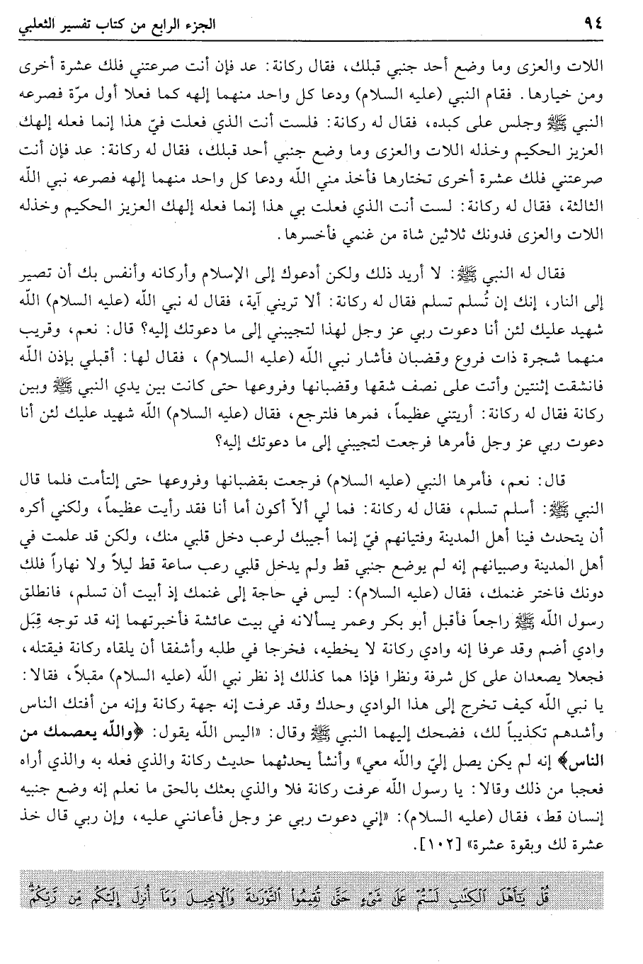 اللات والعزى وما وضع أحد جنبي قبلك، فقال ركانة: عد فإن أنت صرعتني فلك عشرة أخرى ومن خيارها. فقام النبي (عليه السلام) ودعا كل واحد منهما إلهه كما فعلا أول مرّة فصرعه النبي صلى الله عليه وسلّم وجلس على كبده، فقال له ركانة: فلست أنت الذي فعلت فيّ هذا إنما فعله إلهك العزيز الحكيم وخذله اللات والعزى وما وضع جنبي أحد قبلك، فقال له ركانة: عد فإن أنت صرعتني فلك عشرة أخرى تختارها فأخذ مني الله ودعا كل واحد منهما إلهه فصرعه نبي الله الثالثة، فقال له ركانة: لست أنت الذي فعلت بي هذا إنما فعله إلهك العزيز الحكيم وخذله اللات والعزى فدونك ثلاثين شاة من غنمي فأخسرها.