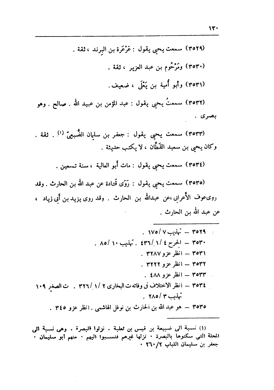 3533 - سَمِعت يحيى يَقُول جَعْفَر بن سُلَيْمَان الضبعِي ثِقَة وَكَانَ يحيى بن سعيد الْقطَّان لَا يكْتب حَدِيثه