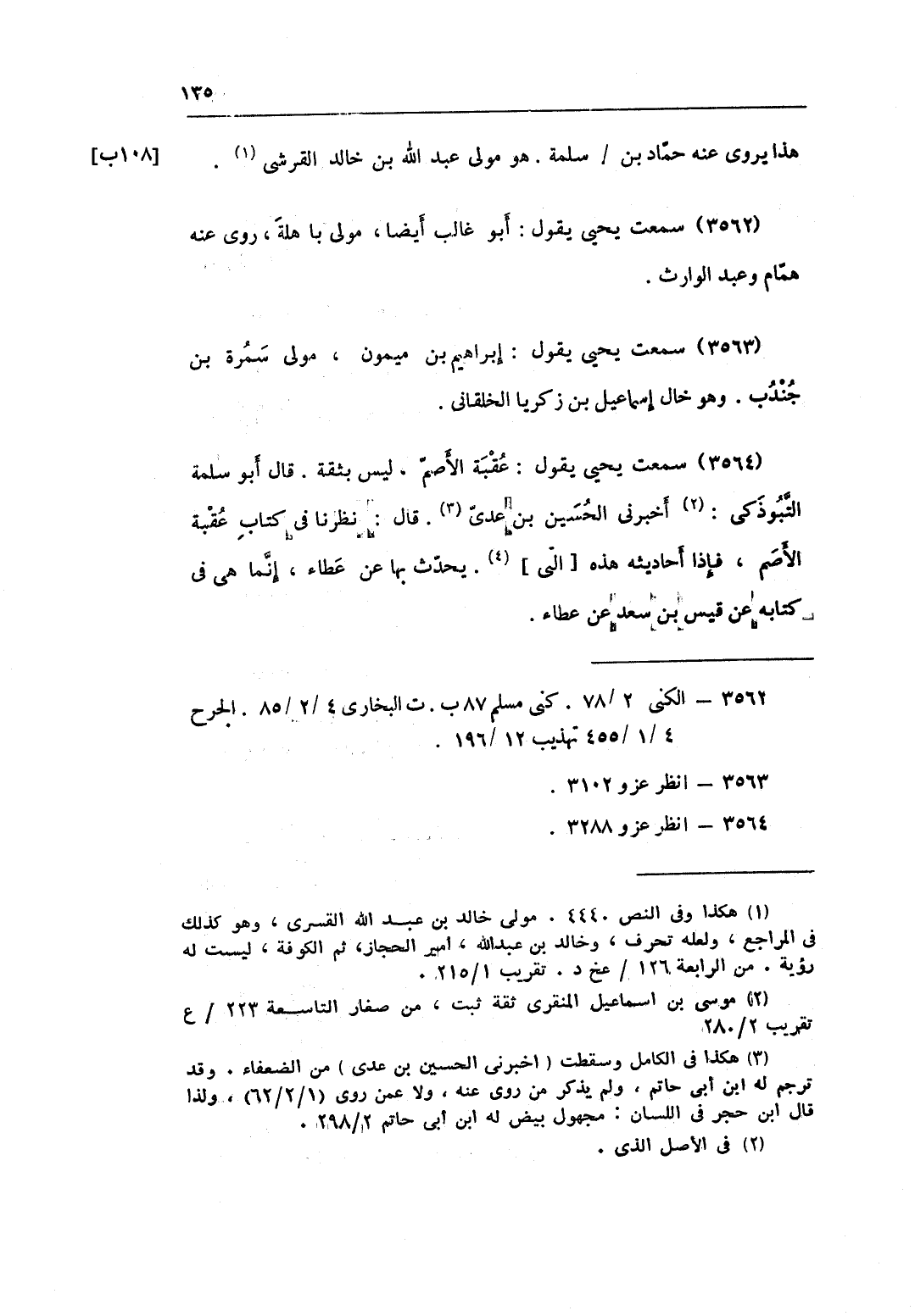 3564 - سَمِعت يحيى يَقُول عقبَة الْأَصَم لَيْسَ بِثِقَة قَالَ أَبُو سَلمَة التَّبُوذَكِي أَخْبرنِي الْحُسَيْن بن عدي قَالَ نَظرنَا فِي كتاب عقبَة الْأَصَم فَإِذا أَحَادِيثه هَذِه الَّتِي يحدث بهَا عَن عَطاء إِنَّمَا هِيَ فِي كِتَابه عَن قيس بن سعد عَن عَطاء