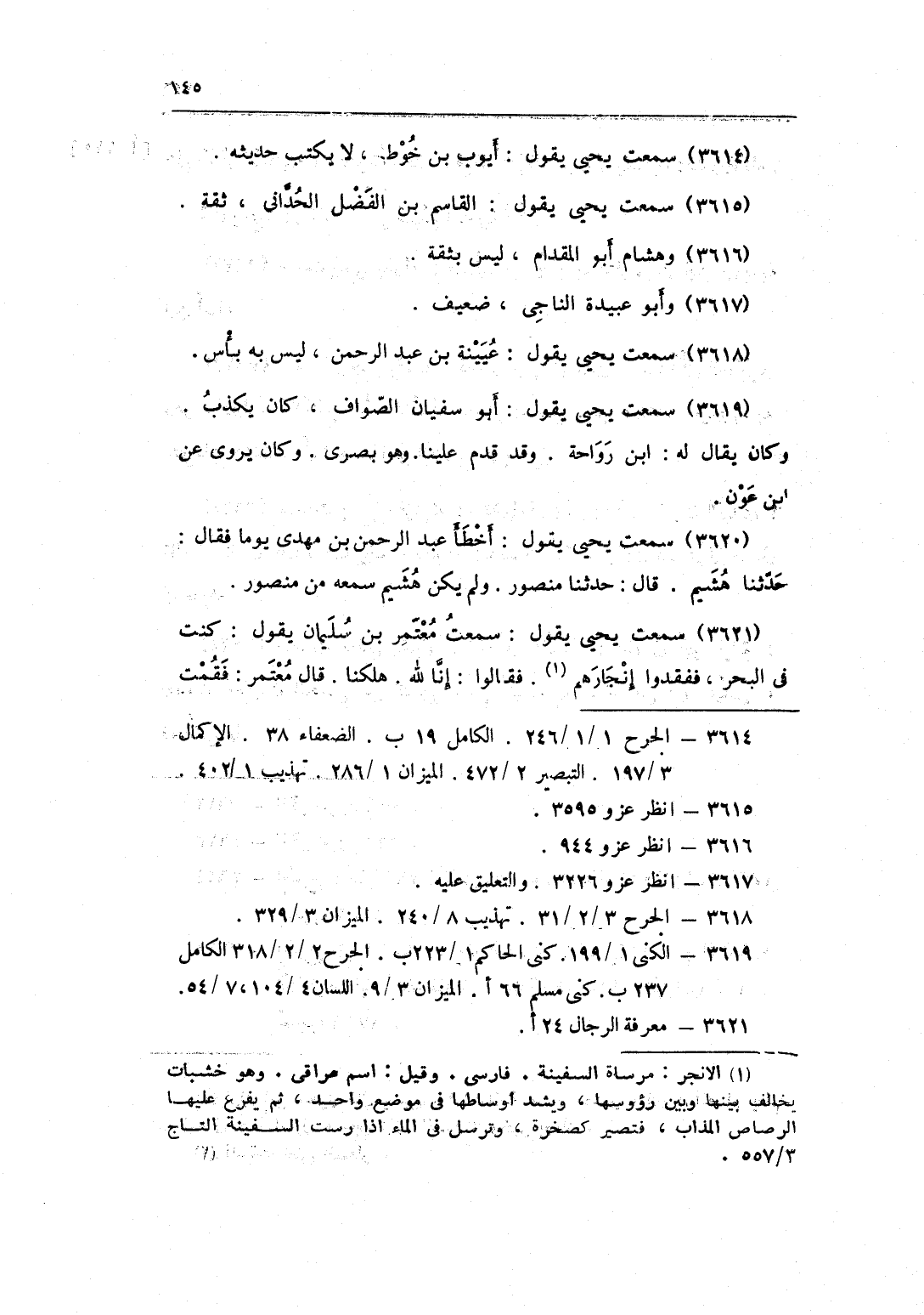 3621 - سَمِعت يحيى يَقُول سَمِعت مُعْتَمر بن سُلَيْمَان يَقُول كنت فِي الْبَحْر ففقدوا إنجارهم فَقَالُوا إِنَّا لله هلكنا قَالَ مُعْتَمر فَقُمْت على صدر السَّفِينَة ودعوت قَالَ فَإِذا أهل السَّفِينَة يَقُولُونَ قد وَجَدْنَاهُ قَالَ يحيى وَكَانَ مُعْتَمر سليم النَّاحِيَة