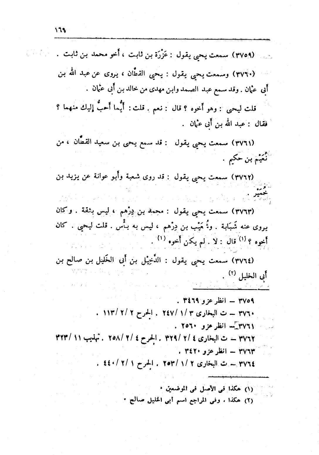 3760 - وَسمعت يحيى يَقُول يحيى الْقطَّان يروي عَن عبد الله بن أبي عُثْمَان وَقد سمع عبد الصَّمد وَابْن مهْدي من خَالِد بن أبي عُثْمَان قلت ليحيى وَهُوَ أَخُوهُ قَالَ نعم قلت أَيّمَا أحب إِلَيْك مِنْهُمَا فَقَالَ عبد الله بن أبي عُثْمَان