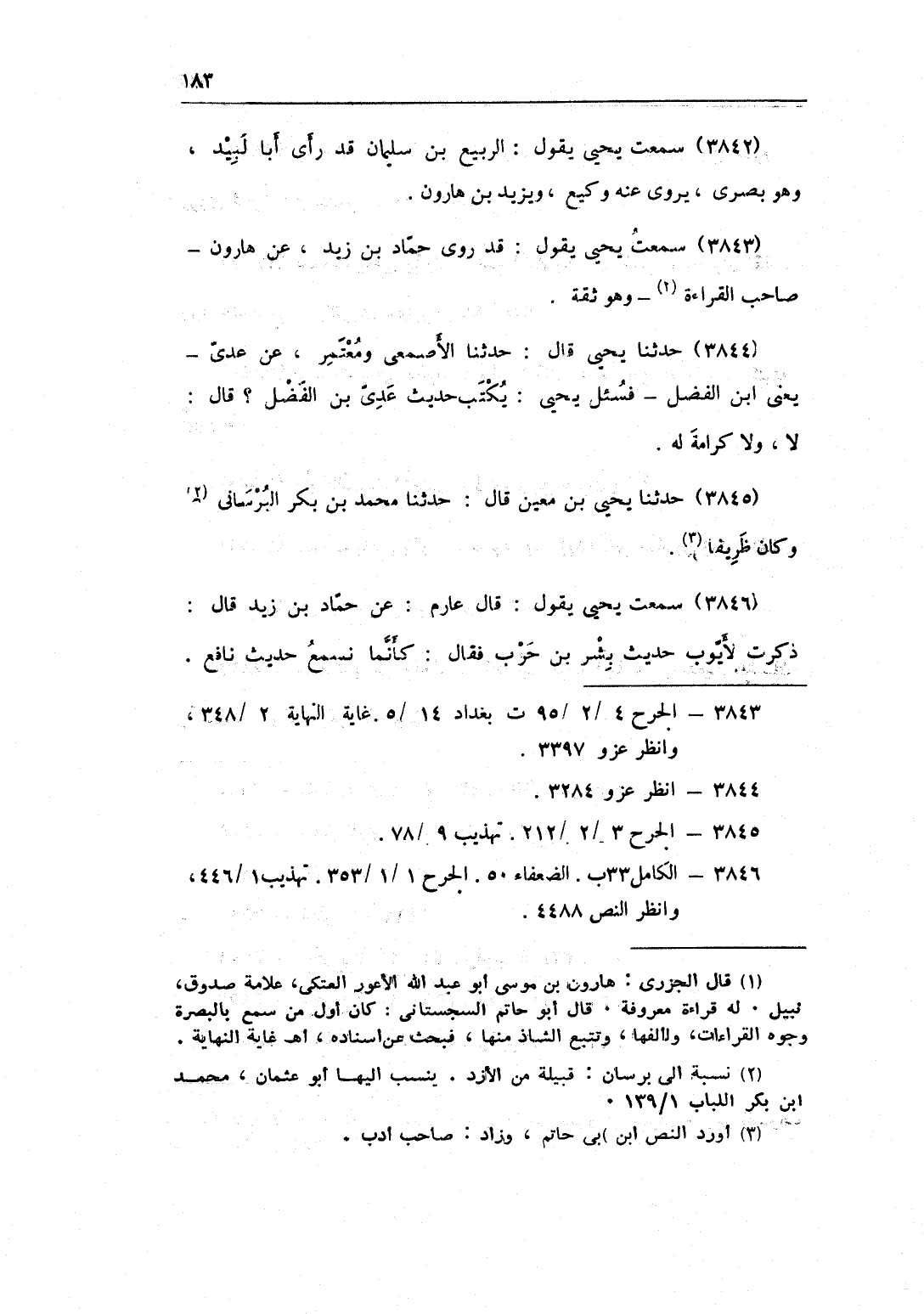 3843 - سَمِعت يحيى يَقُول قد روى حَمَّاد بن زيد عَن هَارُون صَاحب الْقِرَاءَة وَهُوَ ثِقَة