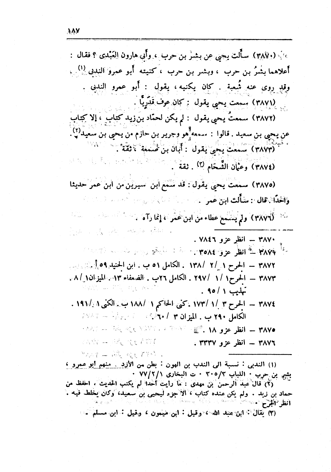 3870 - سَأَلت يحيى عَن بشر بن حَرْب وَأبي هَارُون الْعَبْدي فَقَالَ أعلاهما بشر بن حَرْب وَبشر بن حَرْب كنيته أَبُو عَمْرو الندبي وَقد روى عَنهُ شُعْبَة كَانَ يكنيه يَقُول أَبُو عَمْرو الندبي