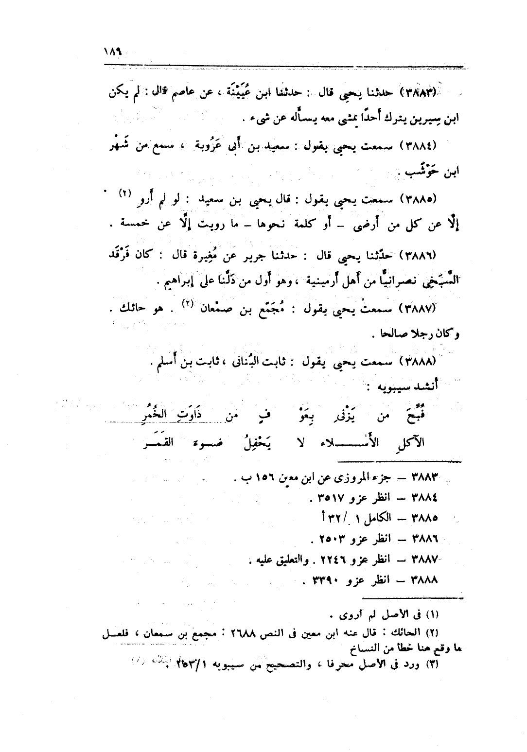 3888 - سَمِعت يحيى يَقُول ثَابت الْبنانِيّ ثَابت بن أسلم أنْشد سِيبَوَيْهٍ ... فبح من يَزْنِي بعوف ... من ذَوَات الْخمر ... ... الْآكِل الأسلاء ... لَا يحفل ضوء الْقَمَر ...