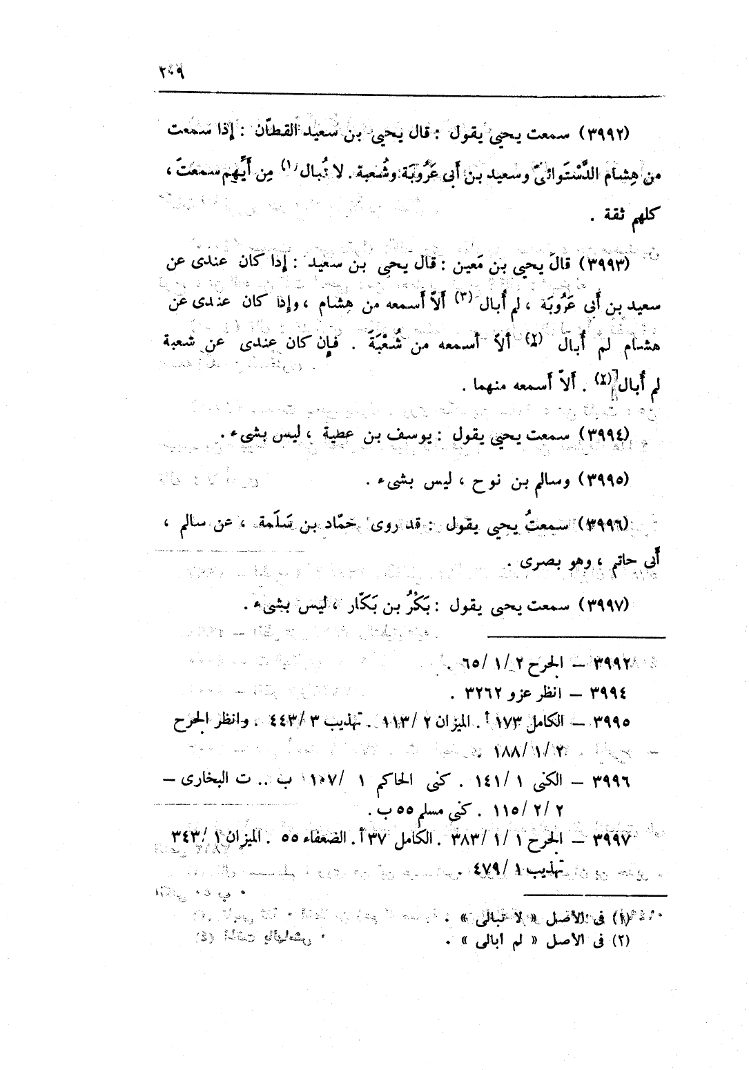 3993 - قَالَ يحيى بن معِين قَالَ يحيى بن سعيد إِذا كَانَ عِنْدِي عَن سعيد بن أبي عرُوبَة لم أبال أَلا أسمعهُ من هِشَام وَإِذا كَانَ عِنْدِي عَن هِشَام لم ابال الا أسمعهُ من شُعْبَة فان كَانَ عِنْدِي عَن شُعْبَة لم أبال الا أسمعهُ مِنْهُمَا