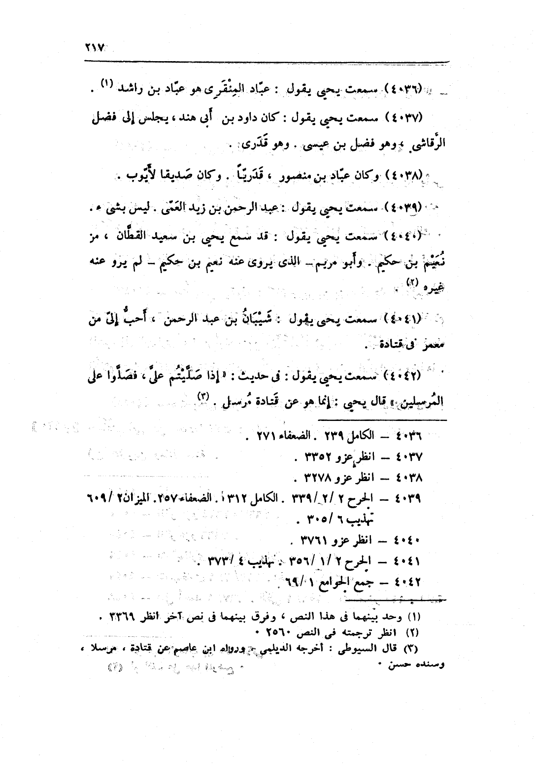 4041 - سَمِعت يحيى يَقُول شَيبَان بن عبد الرَّحْمَن أحب إِلَيّ من معمر فِي قَتَادَة