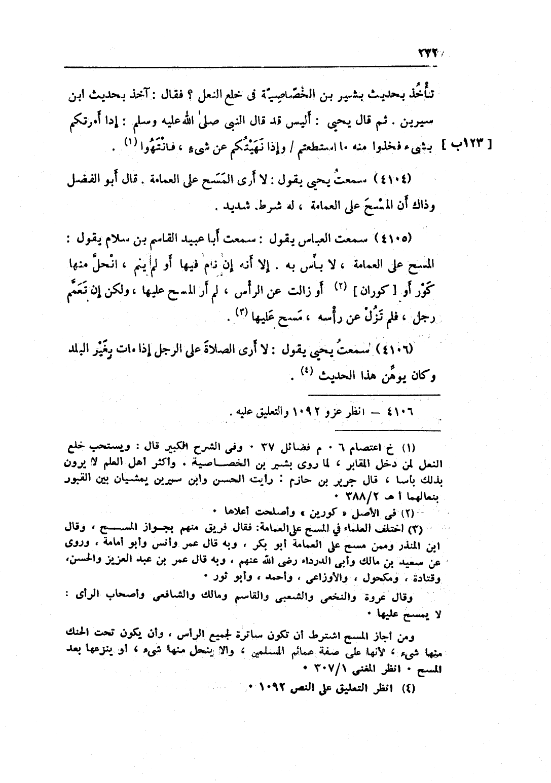 4104 - سَمِعت يحيى يَقُول لَا أرى الْمسْح على الْعِمَامَة قَالَ أَبُو الْفضل وَذَاكَ أَن الْمسْح على الْعِمَامَة لَهُ شَرط شَدِيد